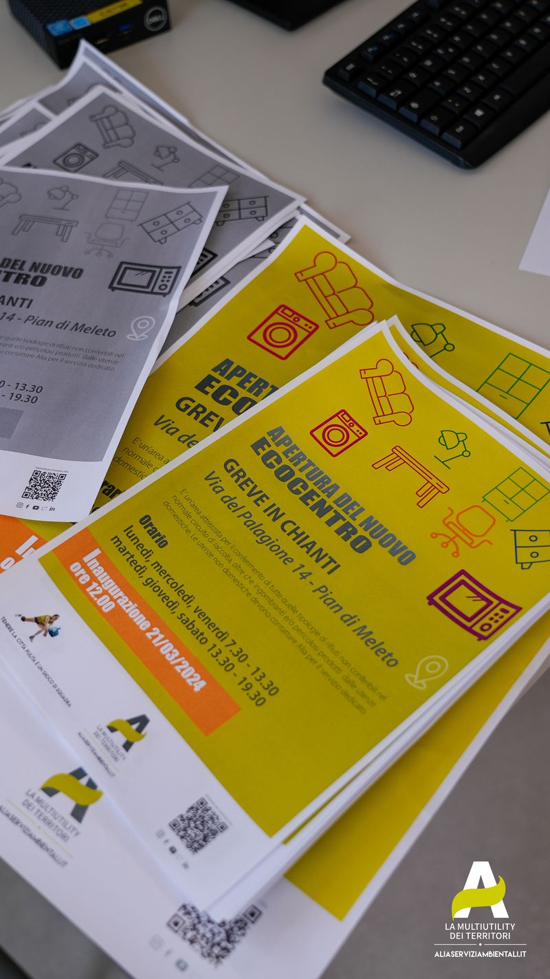 Taglio del nastro e avvio attività per il nuovo Ecocentro di Alia Multiutility a Greve in Chianti, in un’area di circa 3.300 metri quadrati a lato della strada provinciale del Palagione (SP 119), all’interno della zona industriale di Meleto.  Si tratta del 31° Ecocentro attivo sul territorio della Toscana centrale, realizzato con un investimento complessivo di 700mila euro, che si trova in via del Palagione 14, aperto al pubblico ogni lunedì, mercoledì e venerdì dalle 7.30 alle 13.30 e ogni martedì, giovedì e sabato dalle 13.30 alle 19.30.