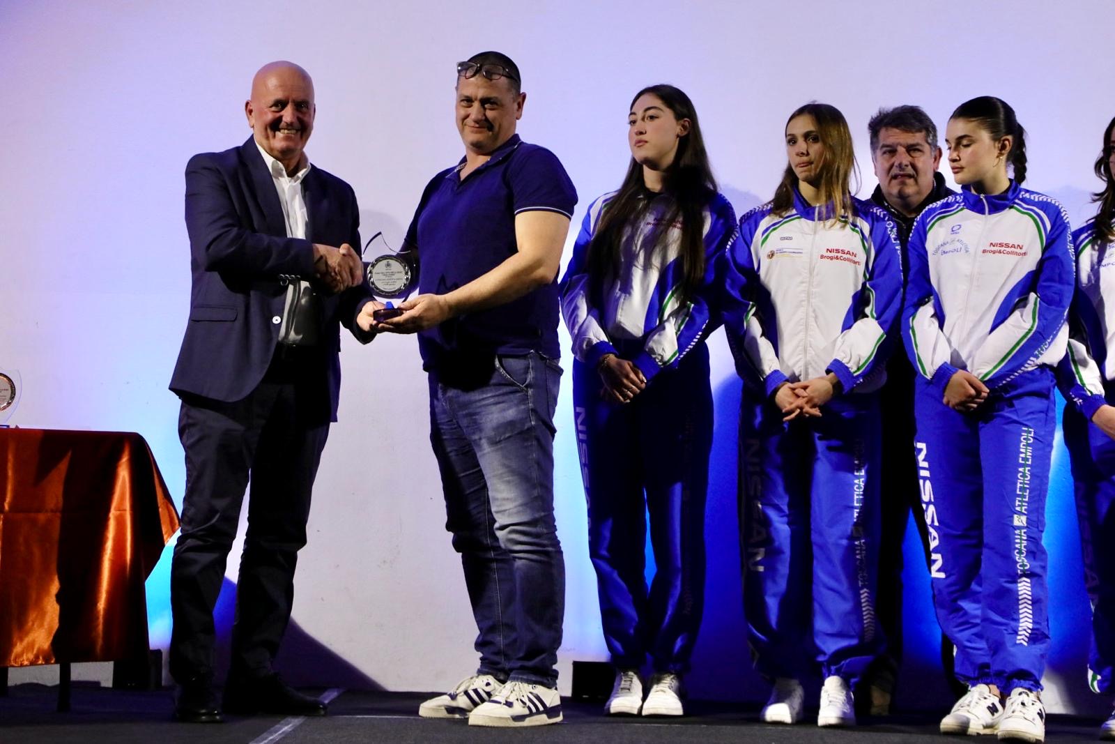 Spazio quindi alle premiazioni. Nella prima sezione, per i risultati migliori raggiunti a livello promozionale, è stata premiata la Uisp Empolese Valdelsa, rappresentata dalla presidente Arianna Poggi: l’associazione sportiva ha inaugurato nel settembre 2023, il primo campo di pickleball a Empoli. A consegnare il premio, la sindaca Barnini, che ha quindi lasciato il microfono all’assessore Biuzzi: a lui il compito di consegnare, insieme alla sindaca, la prima menzione speciale a Marcello Chiuchiolo, ex dipendente comunale adesso in pensione che per ben trentacinque anni si è occupato del manto erboso dello stadio ‘Castellani’. Con lui, a ritirare il riconoscimento, la nipotina Nora.