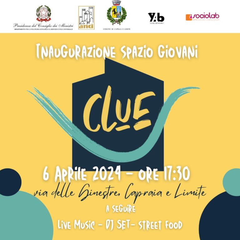 CLUE è un progetto di rigenerazione urbana promosso dal Comune di Capraia e Limite e dall’associazione culturale YAB, con il supporto metodologico della cooperativa e impresa sociale Sociolab, realizzato grazie al finanziamento concesso dalla Presidenza del Consiglio dei Ministri – Dipartimento per le politiche giovanili e del Servizio civile universale a valere sul “Fondo per le politiche giovanili” - in collaborazione con Anci e con il cofinanziamento del Comune.