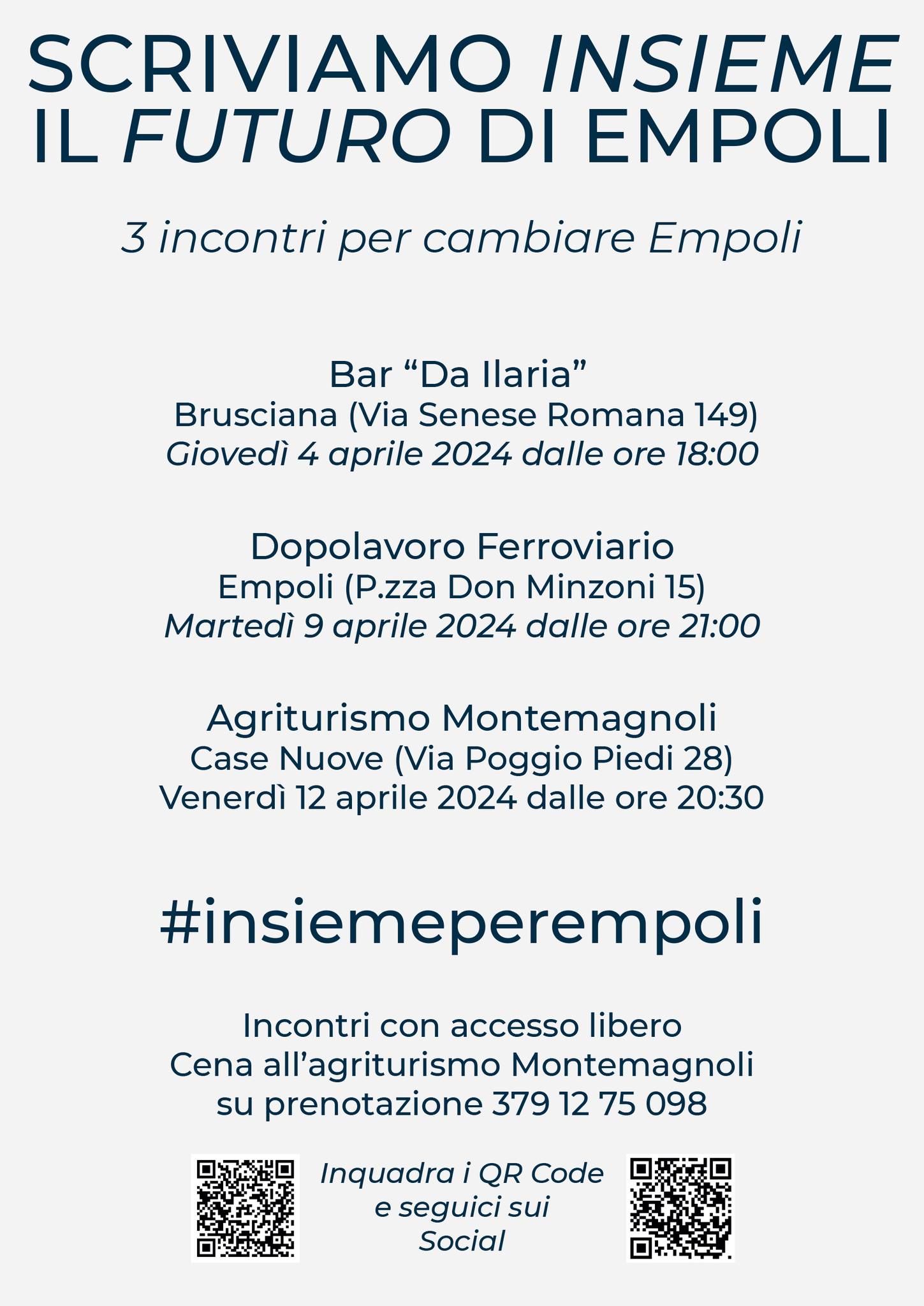 “Ci apriamo alla cittadinanza – spiega Andrea Poggianti – dopo una decina di riunioni presso il mio Comitato con i componenti delle liste che mi sostengono per predisporre una bozza di programma elettorale. Adesso siamo pronti a confrontarci con gli empolesi e a coinvolgerli per scrivere insieme il futuro della nostra città. Ad ogni appuntamento ci saranno dieci tavoli dedicati ad altrettanti macro temi e in ciascuno saranno presenti due candidati consigliere delle nostre liste per moderare il dibattito raccogliendo richieste e spunti di riflessione dei partecipanti”.