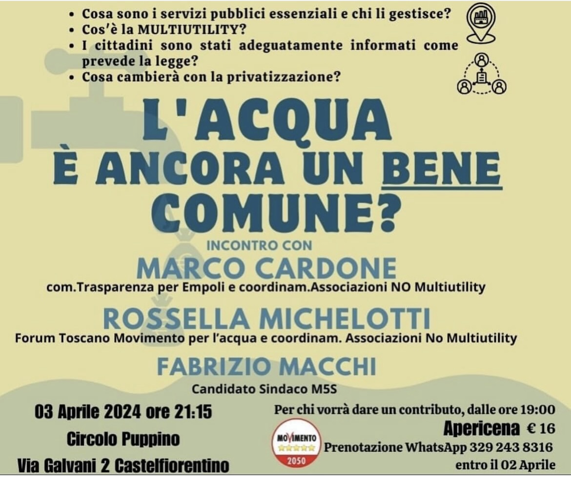 Per chiarire i dubbi e gli aspetti negativi di questa operazione e per fare informazione trasparente alla cittadinanza, in assenza di comunicazioni da parte delle amministrazioni coinvolte, il Movimento 5 Stelle ha organizzato un evento aperto alla cittadinanza in programma oggi, mercoledì 3 aprile a Castelfiorentino, presso il Circolo Puppino".