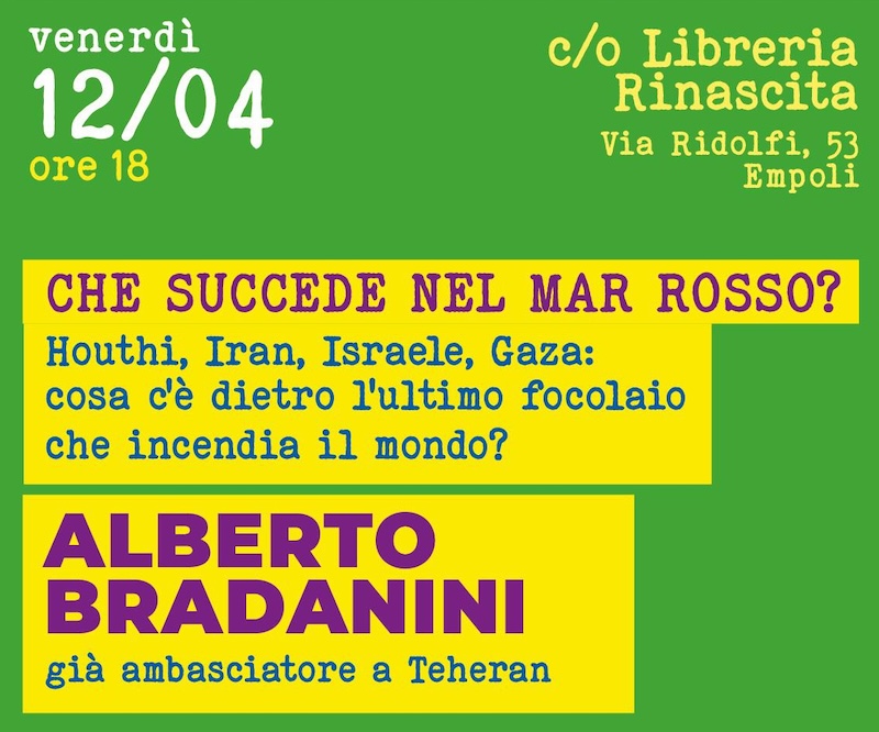 Che succede nel mar Rosso? Che legame c’è fra gli Houthi e la situazione in Palestina e, più in generale, in medio oriente? A queste domande darà una risposta il comitato ‘Empoli per la pace’ con un nuovo appuntamento del ciclo ‘conoscere per costruire la pace’. Venerdì 12 alle 18, la libreria Rinascita di via Ridolfi ospiterà infatti Alberto Bradanini che torna così a Empoli ospite del comitato.