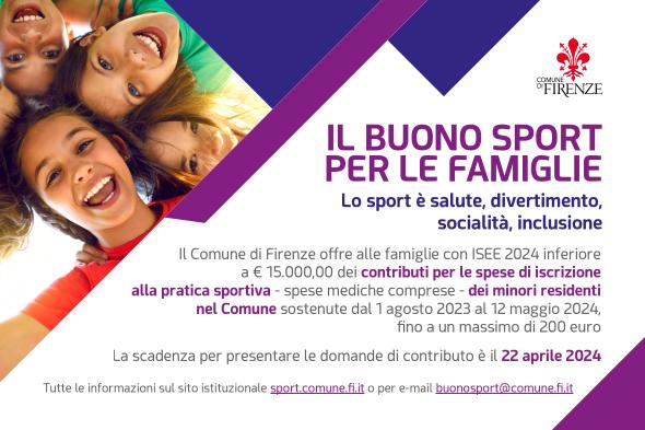 Un 'Buono Sport' per la copertura, integrale o parziale, delle spese sostenute dalle famiglie dal 1 agosto 2023 al 12 maggio 2024 per l’iscrizione alla pratica sportiva dei figli al di sotto dei 18 anni di età e residenti nel Comune di Firenze. L'amministrazione ha lanciato l’iniziativa, grazie ad un investimento di 250mila euro, attraverso un apposito avviso rivolto alle famiglie.