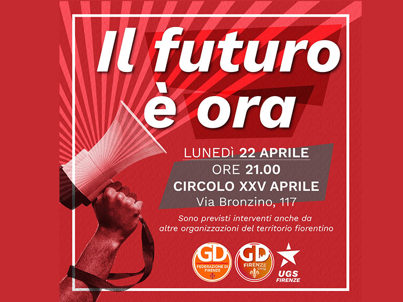Lunedì 22 aprile alle 21 si terrà, presso la Casa del Popolo XXV Aprile in via del Bronzino 117, "Il futuro è ora!", la conferenza programmatica di Giovani Democratici e Unione Giovani di Sinistra di Firenze.