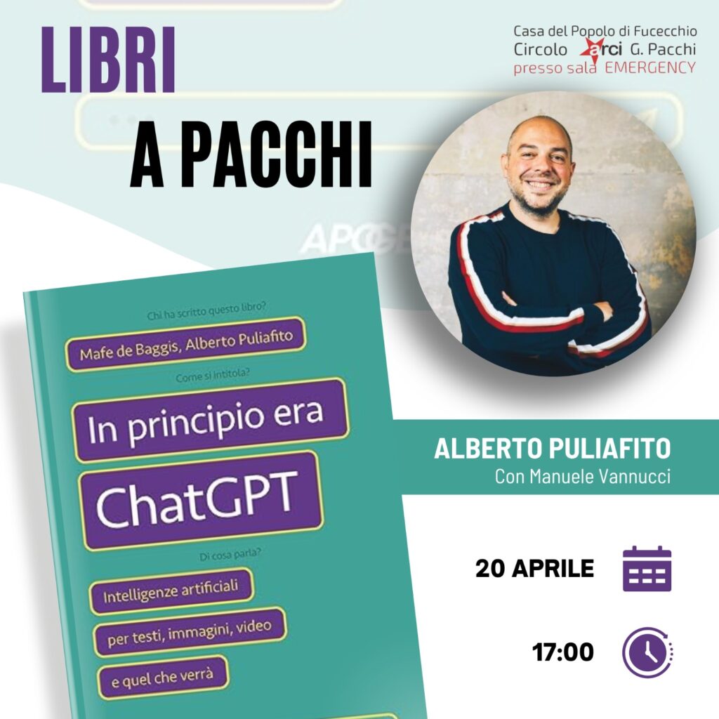 Nuovo capitolo per la rassegna "Libri a Pacchi" del circolo G. Pacchi di Fucecchio, ciclo di incontri dedicati alla letteratura e alla saggistica contemporanea, con la presenza degli autori. Sabato 20 aprile alle ore 17 sarà protagonista il libro "In principio era ChatGPT" di Alberto Puliafito e Mafe De Baggis, con la partecipazione dell'autore Alberto Puliafito, introdotto da Manuele Vannucci, consigliere del Circolo.