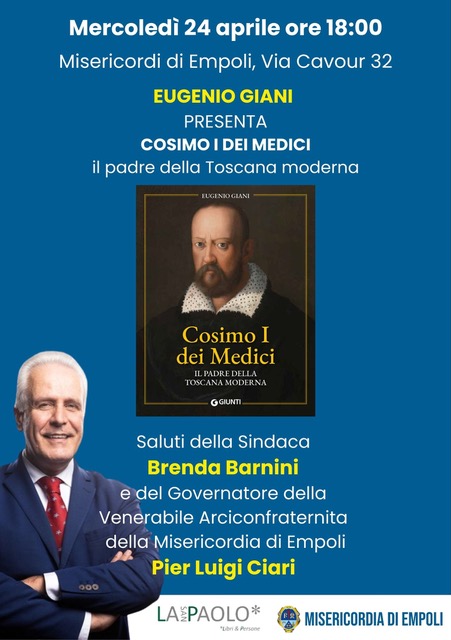 “Siamo veramente contenti- commenta il Governatore della Misericordia di Empoli Pier Luigi Ciari- di accogliere il Presidente della Regione Toscana, Eugenio Giani, nella nostra Arciconfraternita per questo incontro dedicato alla presentazione del suo libro “Cosimo I dei Medici, il padre della Toscana moderna”. La nostra Misericordia ha un legame profondo con la storia fiorentina e con i personaggi della famiglia Medici, sarà interessante ricordare queste relazioni attraverso la figura di Cosimo I, guidati dalla competenza e passione di un esperto e scrupoloso conoscitore della storia di Firenze come Eugenio Giani”.