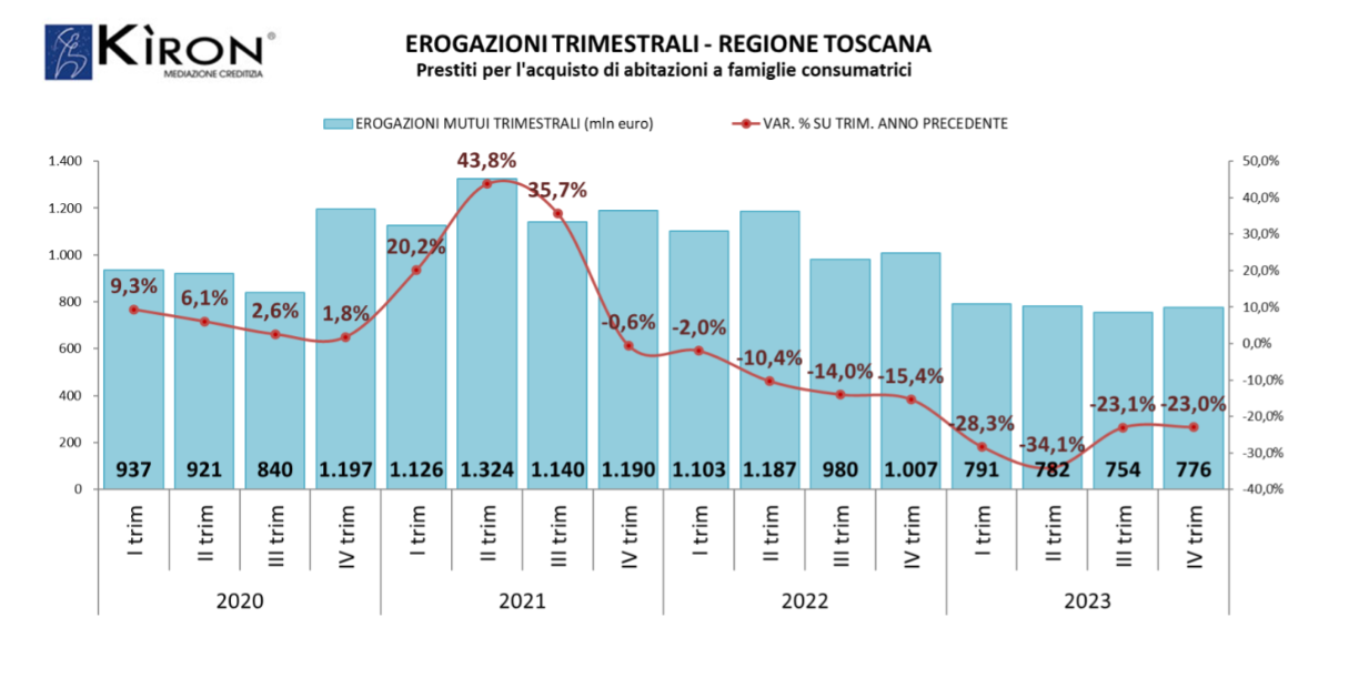 Le famiglie toscane hanno ricevuto finanziamenti per l’acquisto dell’abitazione per 775,8 milioni di euro, che collocano la regione al quinto posto per totale erogato in Italia, con un'incidenza del 7,17%; rispetto allo stesso trimestre dell’anno precedente in regione si registra una variazione delle erogazioni pari a -23,0%, per un controvalore di -231,4 milioni di euro.