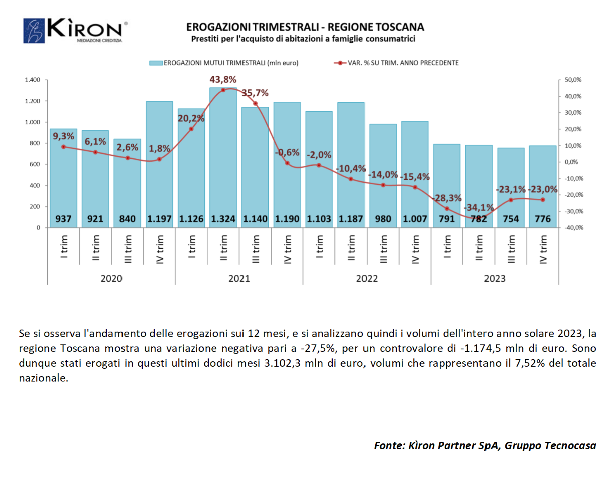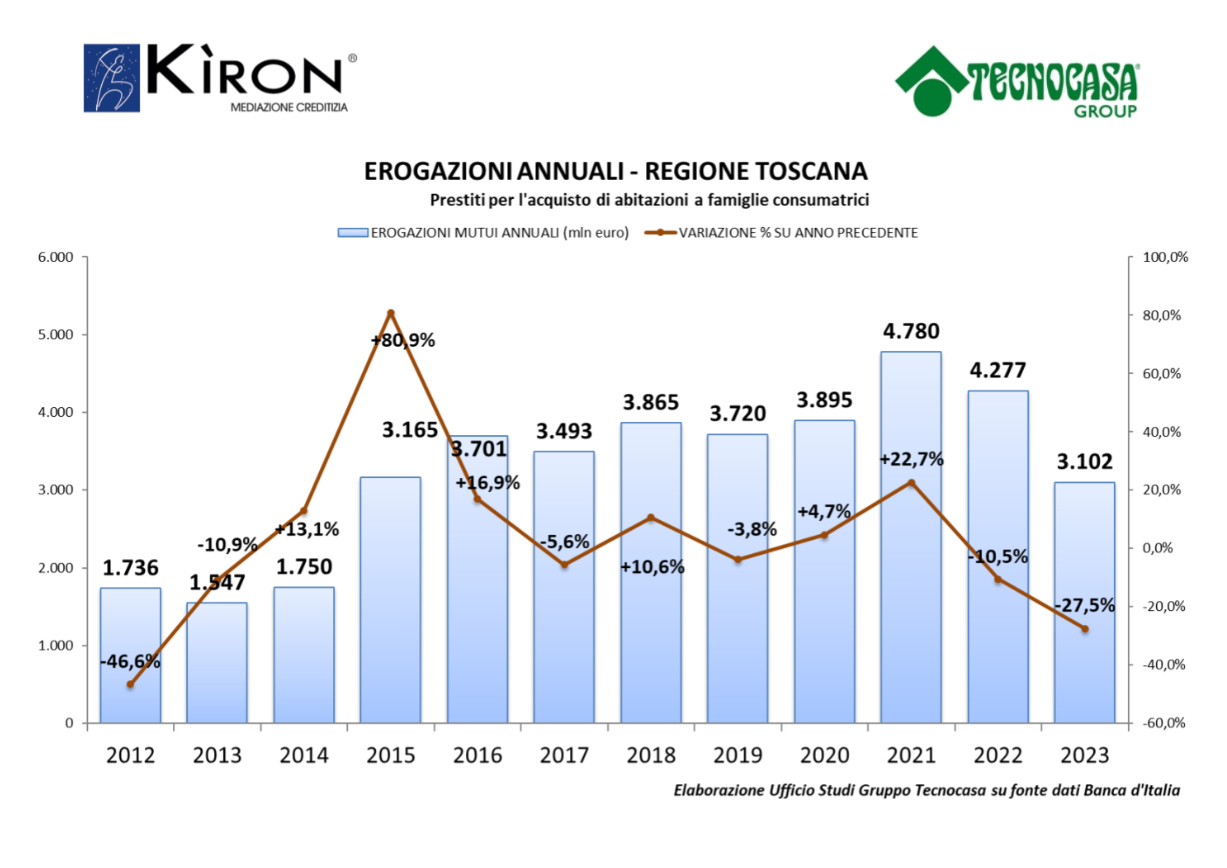 Se si osserva l'andamento delle erogazioni sui 12 mesi, e si analizzano quindi i volumi dell'intero anno solare 2023, la regione Toscana mostra una variazione negativa pari a -27,5%, per un controvalore di -1.174,5 mln di euro. Sono dunque stati erogati in questi ultimi dodici mesi 3.102,3 mln di euro, volumi che rappresentano il 7,52% del totale nazionale.