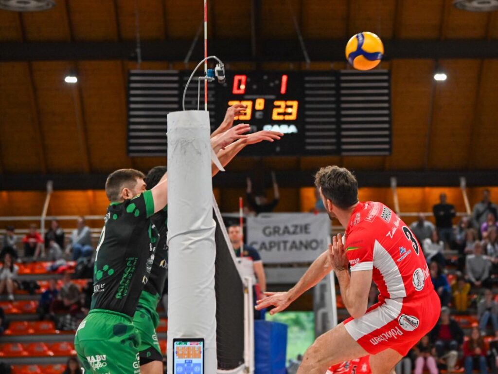 Santa Croce non si da per vinta e e nel quarto set si porta avanti 4-6 grazie al servizio di Mati. Coscione, Parodi e Loreti sono una certezza e sigillano il +2: 7-9. Galliani viene fermato due volte a muro, sul servizio di Coscione, e i biancorossi prendono il largo: 8-12. Denora chiede il primo time-out del parziale ma i suoi interrompono il breakpoint solo sul 9-14. Parodi sugli scudi allarga maggiormente il gap e l’ace di Mati firma l’11-19. Nonostante i tentativi di Agenier e compagni, Santa Croce entra nella fase calda del set sul 14-20. Quagliozzi entrato dalla panchina per Monguzzi cerca di accorciare il gap fino al set point consegnato da un errore dei padroni di casa sul 18-24. Gatto, sugli scudi, chiude 19-25. Si decide tutto nel set corto.