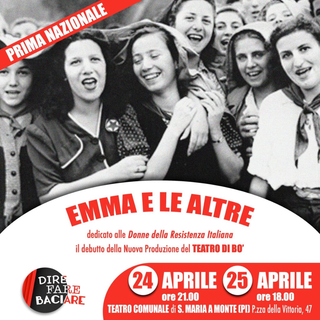 In occasione della Festa della Liberazione, debutta in Prima Nazionale al Teatro Comunale di Santa Maria a Monte (PI), Piazza della Vittoria 47, lo spettacolo del Teatro di Bo’ “Emma e le altre”. Un doppio appuntamento Mercoledì 24 alle ore 21 e Giovedì 25 Aprile alle 18: uno spettacolo tra voci, canti popolari e musiche per ricordare e non dimenticare le Donne nella Resistenza Italiana