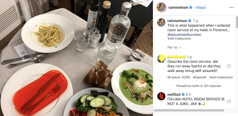 “Ecco cosa è successo quando ho ordinato il servizio in camera nel mio hotel a Firenze” si legge nel post Instagram di Rainn Wilson. Tra i commenti si segnalano quello del collega nel cast Ed Helms ("Divertente e bellissimo!") o quello di Netflix, ma colpisce più di tutti la risposta dell'hotel, da dove si augurano che Wilson abbia "apprezzato il servizio in camera". Una gag, stavolta non sul set, che ha strappato molti sorrisi.