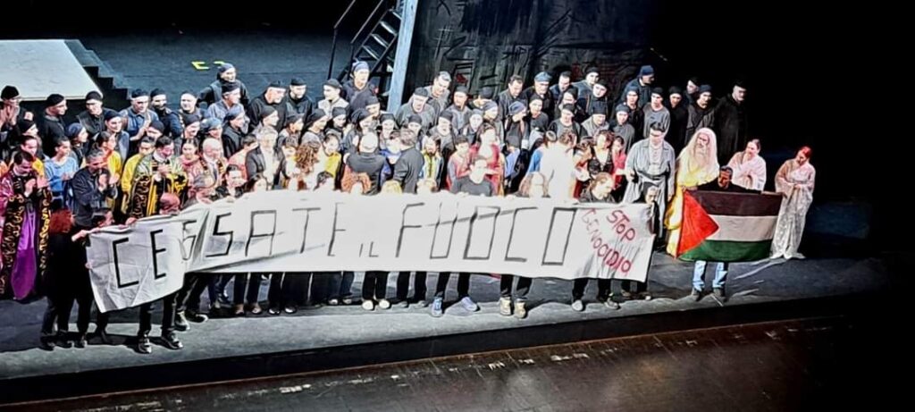 Ieri sera sul palco del Teatro Goldoni di Livorno, al momento degli applausi finali gli attori e i protagonisti dell'opera lirica Turandot hanno esposto uno striscione con la scritta 'Cessate il fuoco Stop al genocidio' e sventolato una bandiera palestinese.