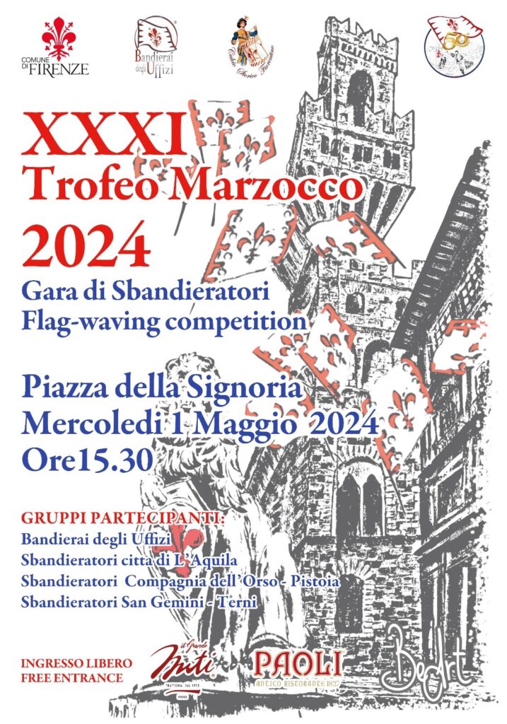 Il Trofeo vedrà impegnati in Piazza della Signoria, mercoledì 1° Maggio dalle 15,30, quattro gruppi di sbandieratori: i Bandierai degli Uffizi, del Corteo Storico della Repubblica Fiorentina; gli sbandieratori Città dell’Aquila; la Compagnia dell’Orso di Pistoia e gli sbandieratori San Gemini - Terni.