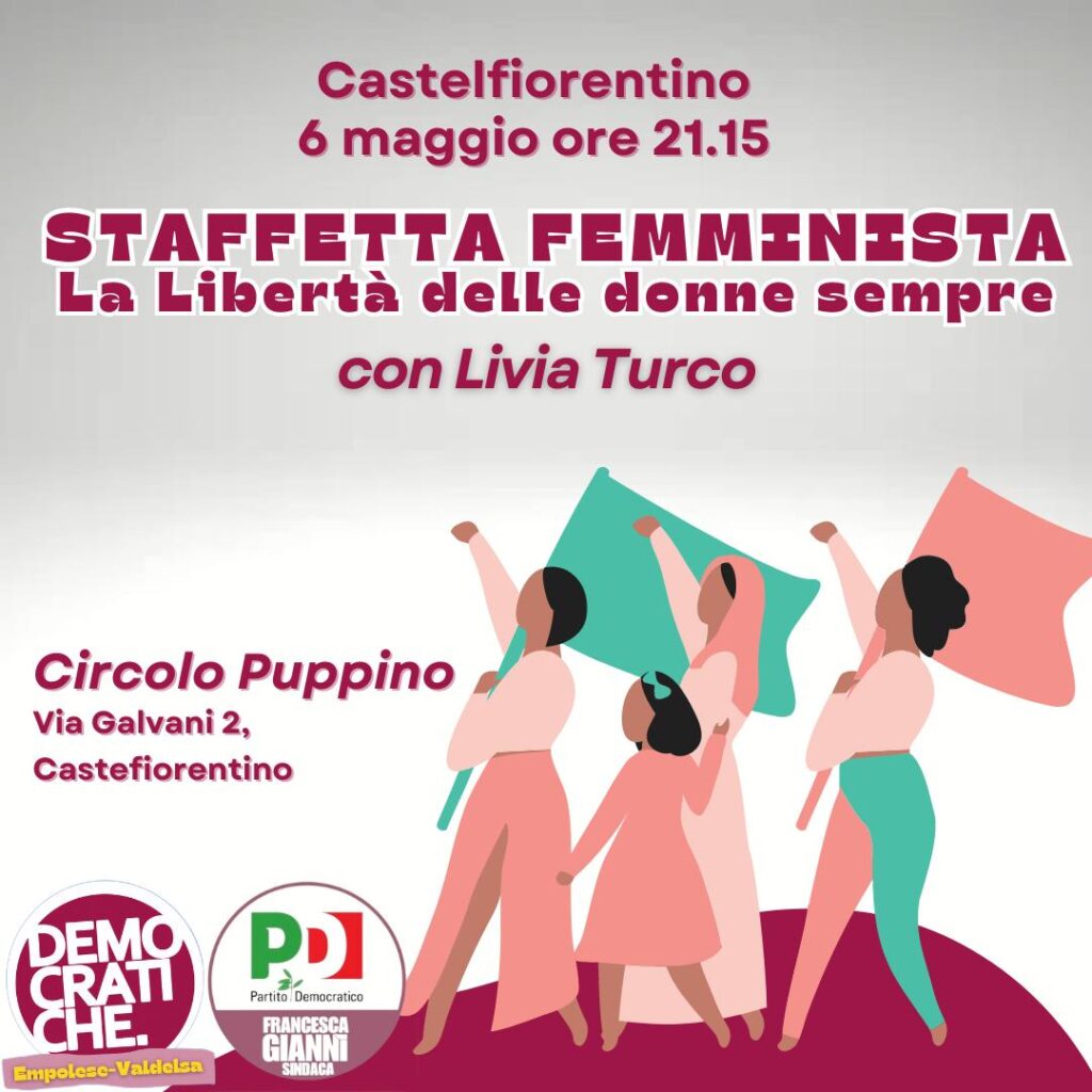 Dalle ore 21.15 al Circolo Puppino in via Galvani 2 avrà infatti luogo l’iniziativa “Staffetta femminista. La Libertà delle donne sempre”, organizzata dalla Conferenza delle donne democratiche dell’Empolese Valdelsa in collaborazione con il Pd di federazione e quello di Castelfiorentino per mettere al centro i temi legati alla parità di genere e le iniziative possibili, anche a livello locale, con Livia Turco e tante voci di donne impegnate in politica e non solo.