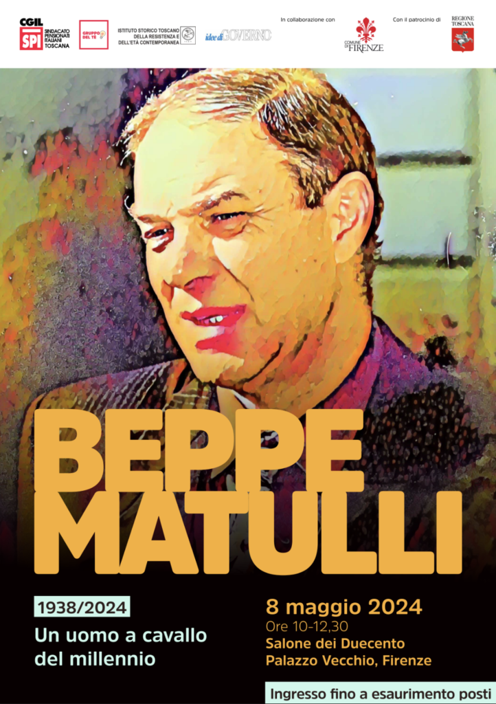 Mercoledì 8 maggio a Firenze lo Spi Cgil Toscana, il “Gruppo del tè”, l’Istituto Storico Toscano della Resistenza e dell’Età contemporanea e la rivista Idee di Governo, in collaborazione con il Comune di Firenze e con il patrocinio della Regione Toscana, ricordano la figura di Giuseppe Matulli attraverso il convegno “Beppe Matulli 1938/2024 Un uomo a cavallo del millennio”, che si terrà nel Salone dei Duecento di Palazzo Vecchio con inizio alle ore 10.00.