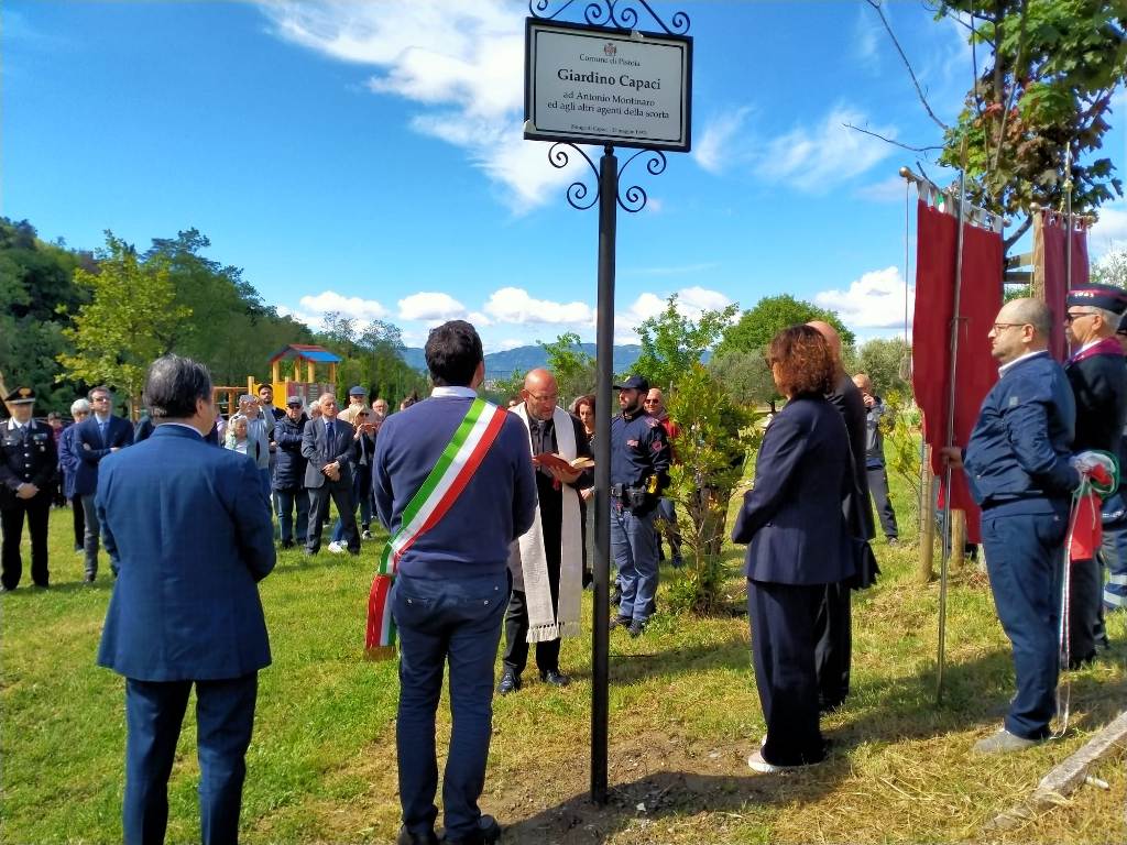 Si è svolta stamani la cerimonia di inaugurazione del giardino pubblico "Capaci" in via Giuseppe Pietri in località Mattia Ponzano, dopo Candeglia, dedicato ad Antonio Montinaro e agli altri agenti di scorta di Giovanni Falcone, rimasti uccisi nella strage di Capaci il 23 maggio 1992. All’iniziativa hanno partecipato, tra gli altri, il sindaco di Pistoia, Tina Montinaro, vedova di Antonio, l’assessore regionale alla legalità Stefano Ciuoffo, il questore di Pistoia e il vice prefetto vicario. Presenti anche i bambini delle classi 5°A e 5°B della scuola primaria Gianni Rodari di Candeglia.
