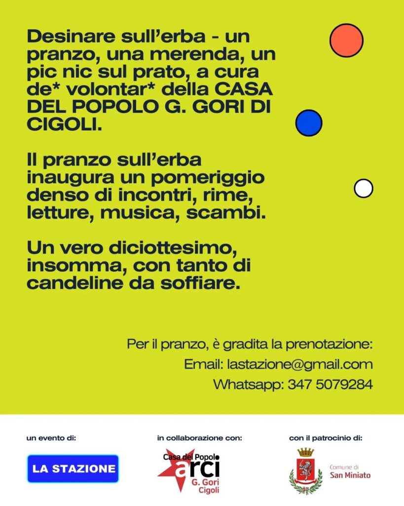 Il sabato un'intera giornata insieme di festa, dal pranzo alla cena (e oltre), con cibo, musica, incontri, letture a altro ancora alla Casa del Popolo di Cigoli. Vi invitiamo quindi a pranzare con comodo sul prato e bervi vostro bicchiere di vino per poi unirci per una discussione volta ad affrontare le 4 macrotematiche dell'evento: