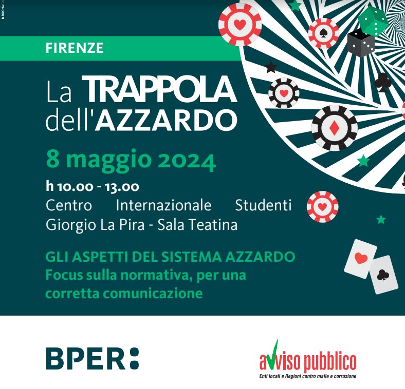 Si svolgerà a Firenze, mercoledì 8 maggio, l’ultima tappa del progetto promosso da Avviso Pubblico e BPER Banca, intitolato “La trappola dell’azzardo”. Un progetto sociale di prevenzione e contrasto al gioco d’azzardo patologico, che ha preso il via lo scorso anno, che ha l’ambizione di creare i possibili anticorpi per tutelare la salute delle comunità, con una particolare attenzione ai più giovani.