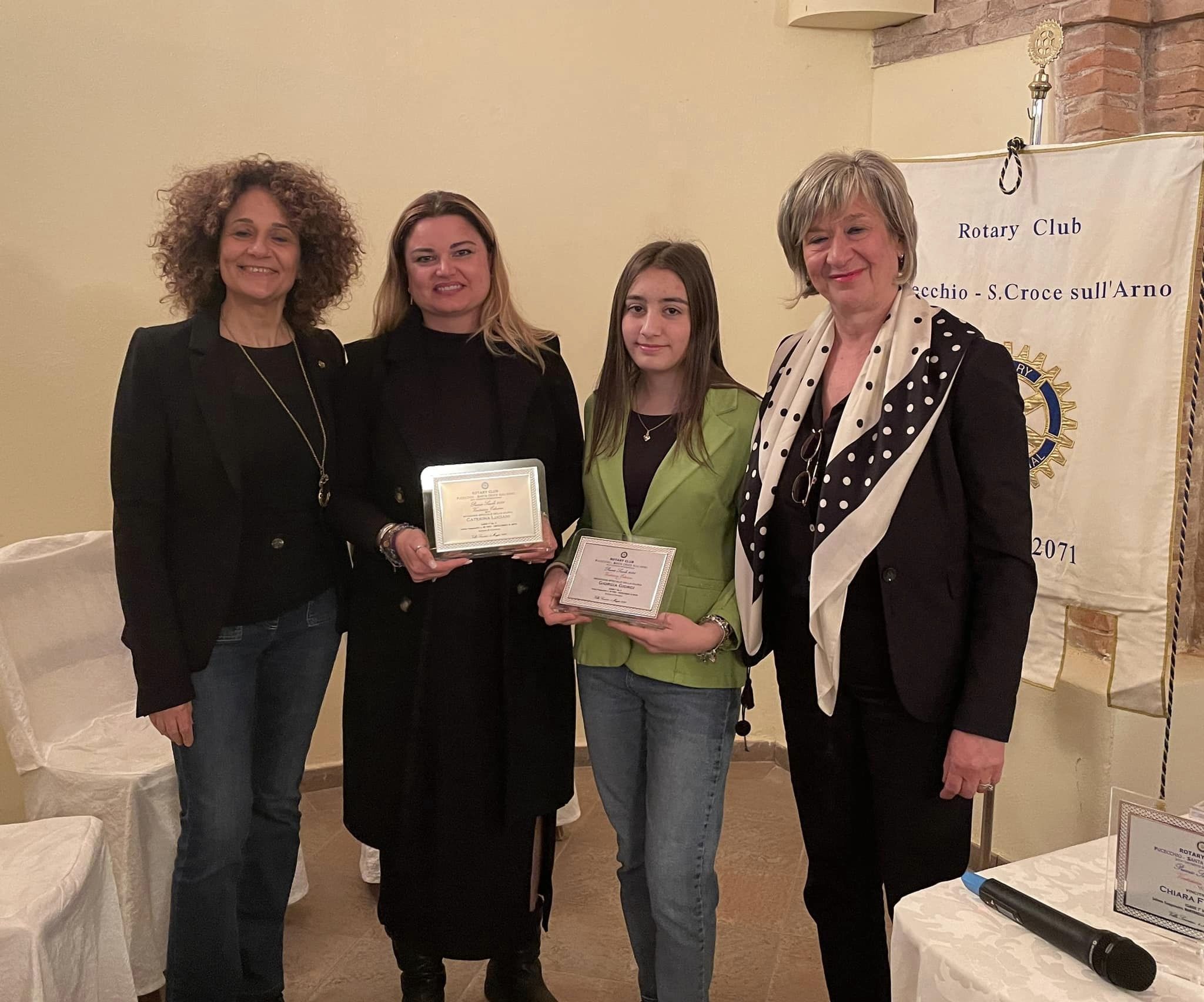 Dopo aver letto i loro temi la vincitrice e le menzionate hanno ricevuto dalla presidente del Rotary di Fucecchio Santa Croce sull’Arno Maria Elena Maffei e dalla presidente della Commissione Premio Scuola, Claudia Neri, una targa per celebrare riconoscimento ottenuto e, per la vincitrice, uno zaino della 41ª Edizione del RYLA.
