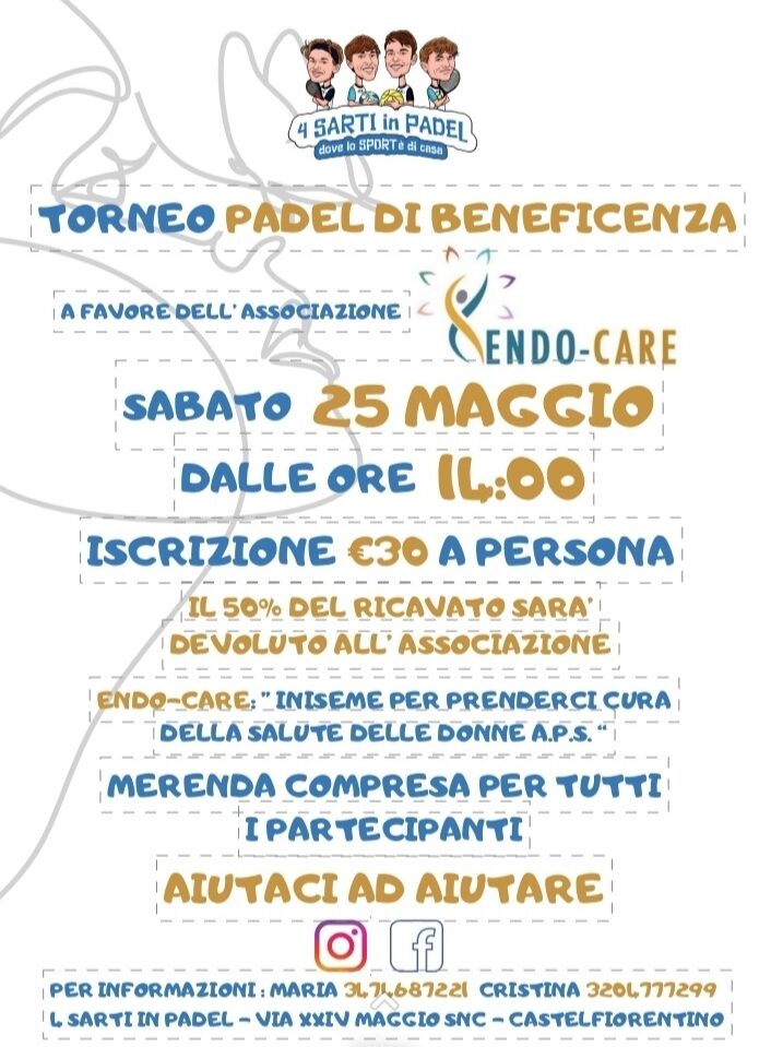 Sabato 25 maggio appuntamento con lo sport e la solidarietà a Castelfiorentino. Dalle ore 14.30 al via il "Torneo Padel di beneficenza", targato "4 Sarti in Padel" a favore dell'associazione Endo-Care, alla quale sarà devoluto metà del ricavato. Ulteriori informazioni nella locandina di seguito.