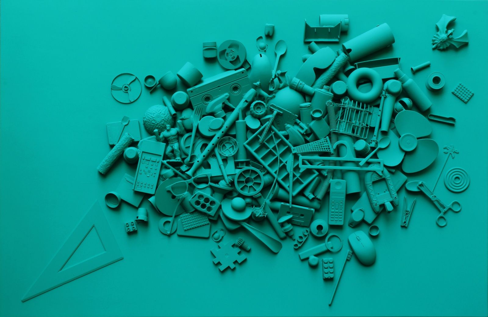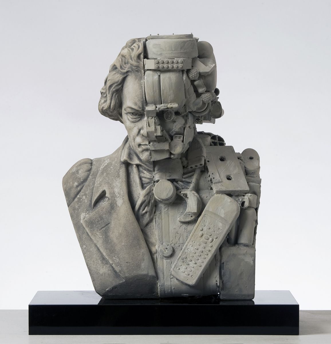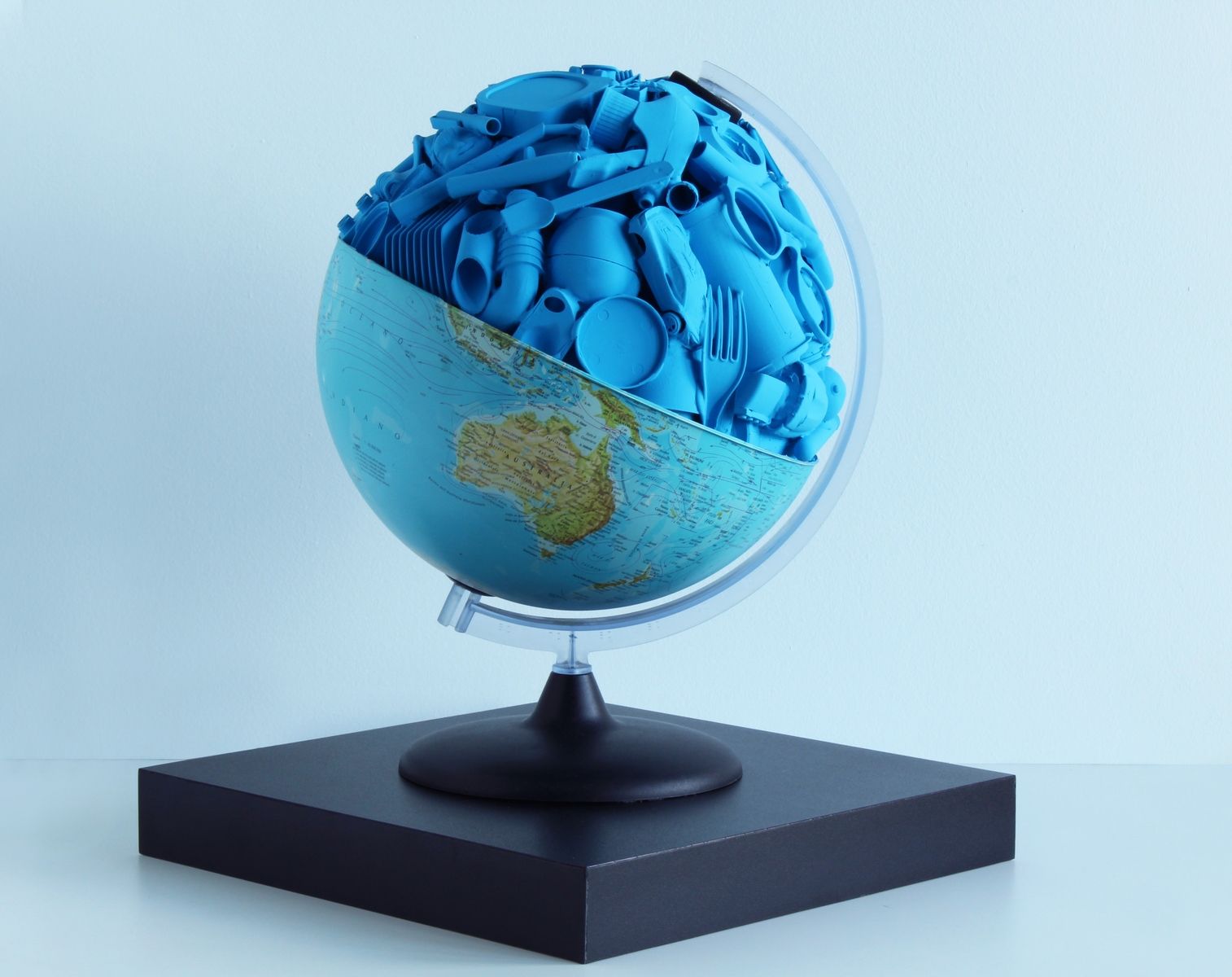 Se nella prima grande sala viene approfondito il tema dell’inquinamento delle acque, con Isole di oggetti (Red island, 2015; Blue island, 2015) che sembrano emergere da un mare di plastica colorata e l’installazione site-specific di una fontanella (Nuova fonte, 2018), che attraverso l’impiego di un secchio da cantiere celebra la fatica del lavoro, invitando a non disperdere neanche una goccia d’acqua, nella successiva stanza sono esposte alcune Mappe, cartine geografiche in cui diversi oggetti ricostruiscono minuziosamente la topografia dei luoghi, per riflettere su quanto il paese di nascita determini le opportunità riservate ad ogni individuo, sebbene tutti viviamo sulla stessa Terra e nella stessa Galassia (2016). Viene quindi posto all’attenzione del pubblico il presente dell’arte nell’era della plastica con una colonna (Le due civiltà, 2016) e due mezzi busti di Beethoven (Ricomposizione, 2011) e del David di Michelangelo (Scomposizione, 2011). Lavori caratterizzati dal meccanismo dell’immagine doppia: da un lato la riproduzione di un’opera classica in materiale plastico e cemento, dall’altro un assemblaggio di oggetti in chiave pop, teso a restituire le modificazioni culturali delle forme anatomiche e del concetto di bellezza dalla classicità al contemporaneo.