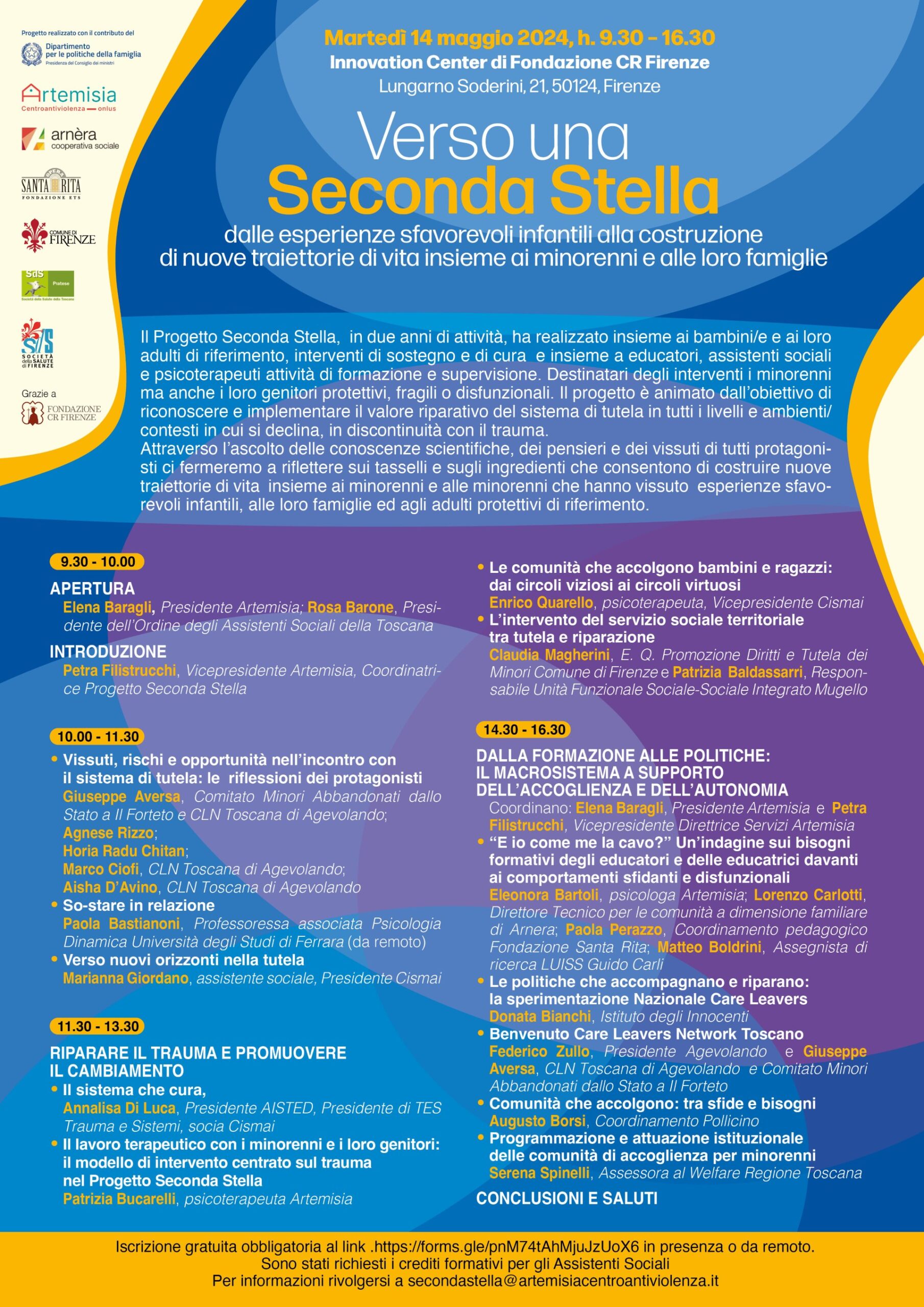 Il convegno è organizzato dall’associazione Artemisia Centro Antiviolenza, capofila del Progetto Seconda Stella finanziato dal Dipartimento per la Famiglia e realizzato con il partenariato di Cooperativa Arnèra, Fondazione Opera Santa Rita, Regione Toscana, Comune e Società della Salute di Firenze, Società della salute del Mugello.