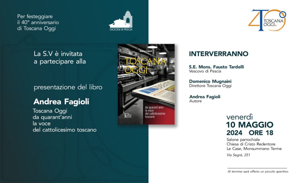 Per questa importante occasione, abbiamo pensato di festeggiare con la presentazione del libro scritto da Andrea Fagioli, primo giornalista assunto da Toscana Oggi e a lungo direttore della stessa Redazione. Fagioli ci racconta in un testo agile ma completo tutta la storia del settimanale in questi primi 40 anni di vita. Un incontro bello e interessante per condividere questa tappa con tutti gli amici abbonati, i lettori, i collaboratori, i parroci e le istituzioni del nostro territorio.