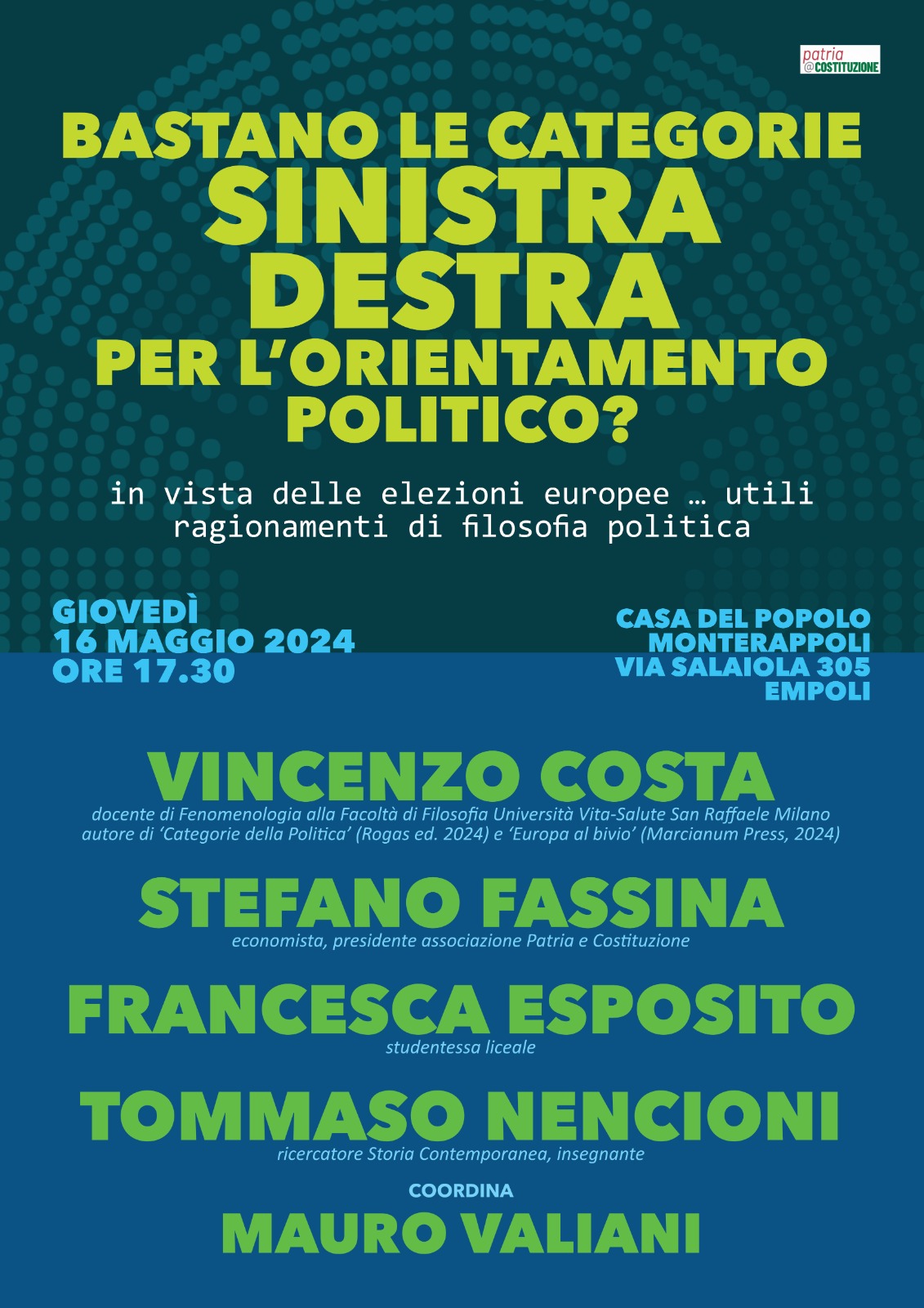 All'iniziativa, promossa dall'associazione "Patria e Costituzione", sarà presentato il libro di Vincenzo Costa, "Categorie della politica" (ediz. Rogas, 2024).