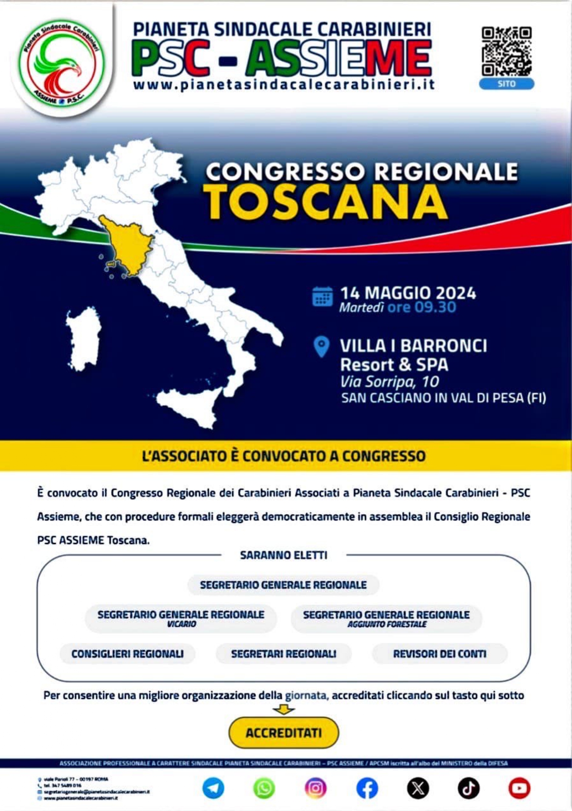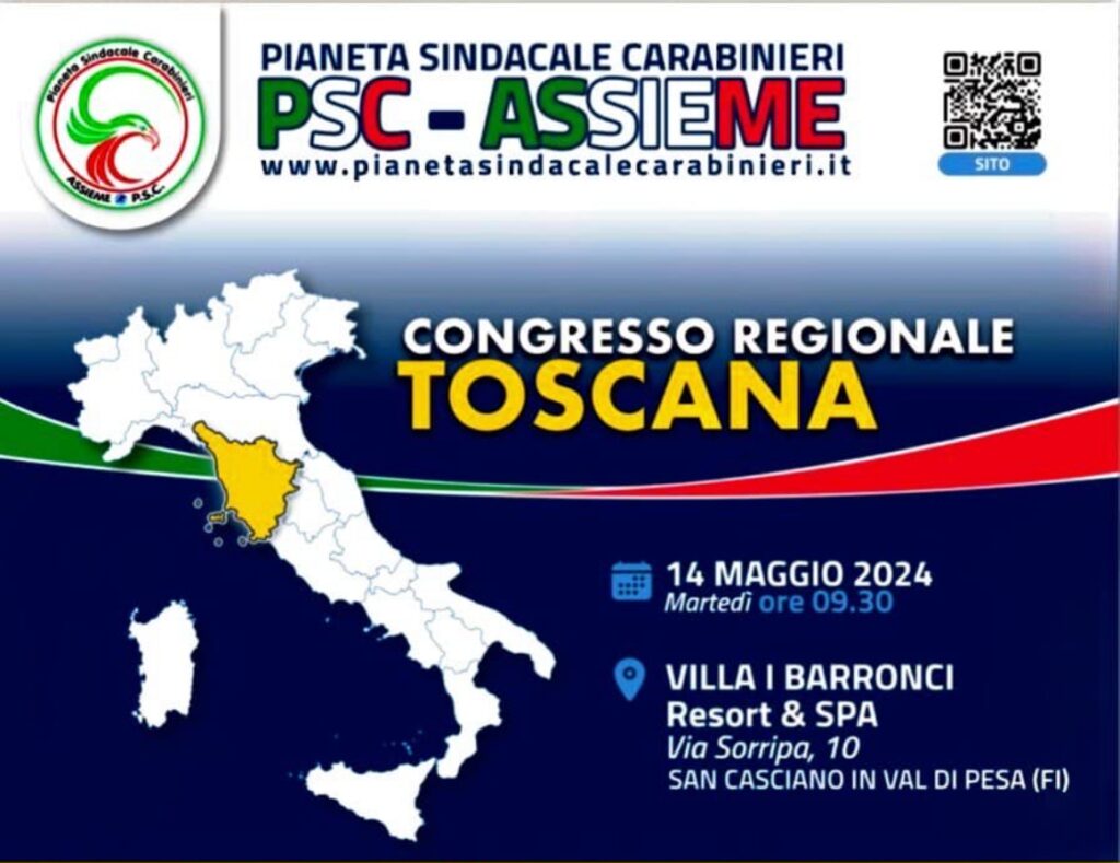 Martedì 14 maggio 2024 la regione Toscana ospiterà il primo Congresso Regionale dell’associazione professionale a carattere sindacale Pianeta Sindacale Carabinieri PSC - ASSIEME.