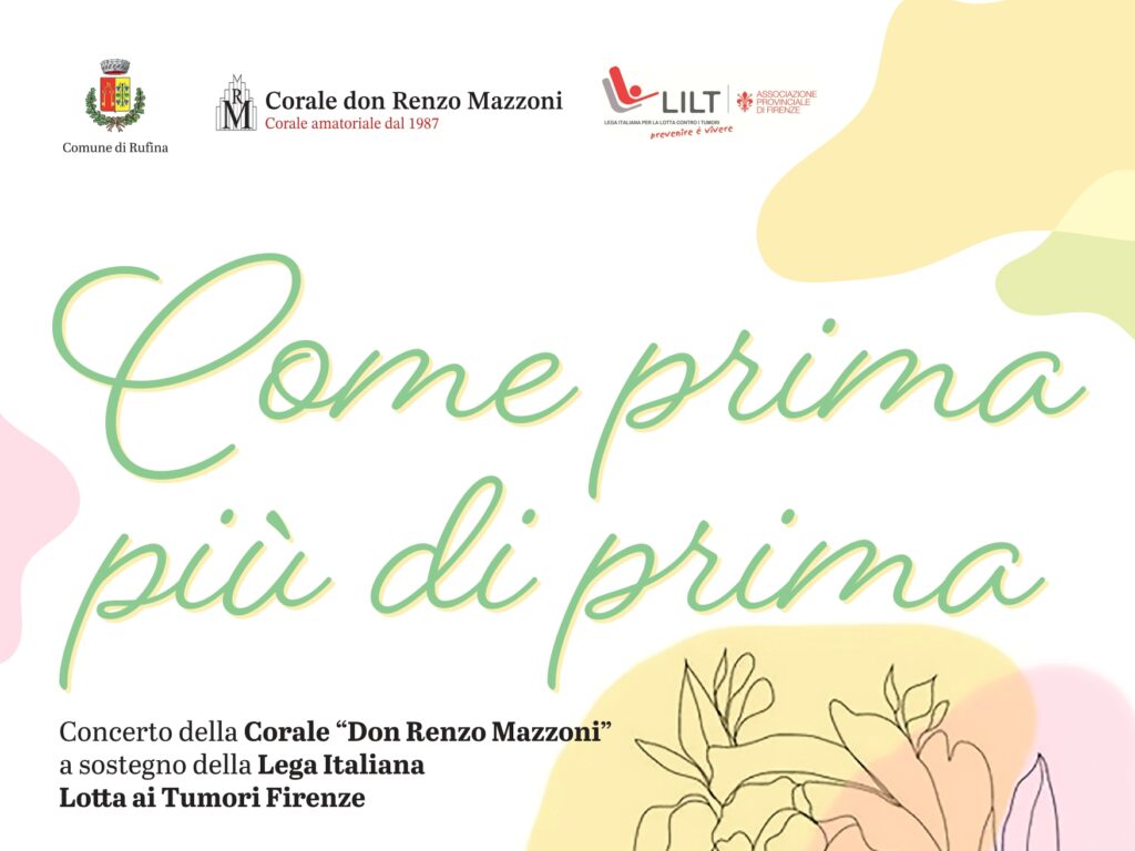 Domenica 19 maggio alle 17 alla Villa Poggio Reale di Rufina si terrà l'evento “Come prima più di prima”, concerto tenuto dalla corale Don Renzo Mazzoni, diretta dal maestro Gabriele Spina, con il maestro Giampiero Bernini al pianoforte.
