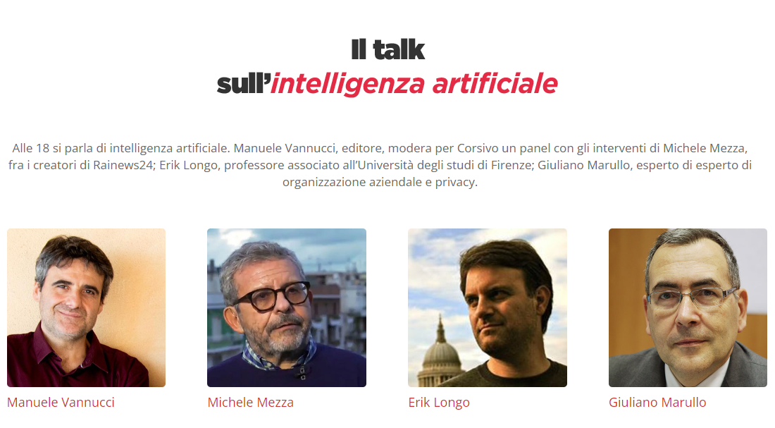 Cos'è l'Intelligenza Artificiale? Di cosa parliamo quando parliamo di AI? Sul palco grandissimi esperti del settore: Michele Mezza, fra i creatori di Rainews24, Erik Longo, professore associato all’Università degli studi di Firenze, e Giuliano Marullo, esperto di esperto di organizzazione aziendale e privacy. Modera Manuele Vannucci, editore e esperto di marketing.