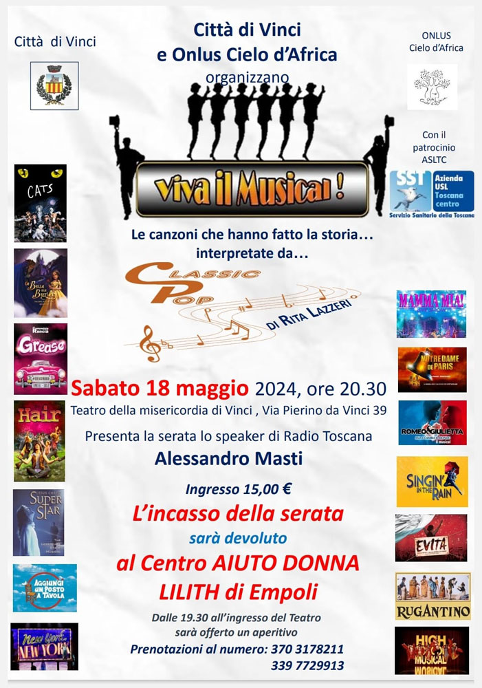 È “Viva il musical”, organizzato dalla Città di Vinci in collaborazione con la Onlus Cielo d’Africa, il cui ricavato sarà destinato al Centro Aiuto Donna Lilith, il centro territoriale che dedica la propria attività al contrasto della violenza sulle donne e che fa parte della Consulta comunale delle pari opportunità.