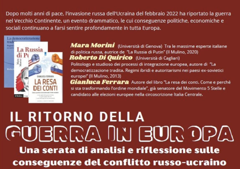 Si parlerà di guerra e delle conseguenze sul conflitto russo-ucraino insieme a Mara Morini, tra le massime esperte italiane di politica russa, a Roberto di Quirico, Docente dell'Università di Cagliari, politologo e studioso di processi di integrazione europea e insieme a Gianluca Ferrara, già senatore del M5S e candidato alle elezioni europee.