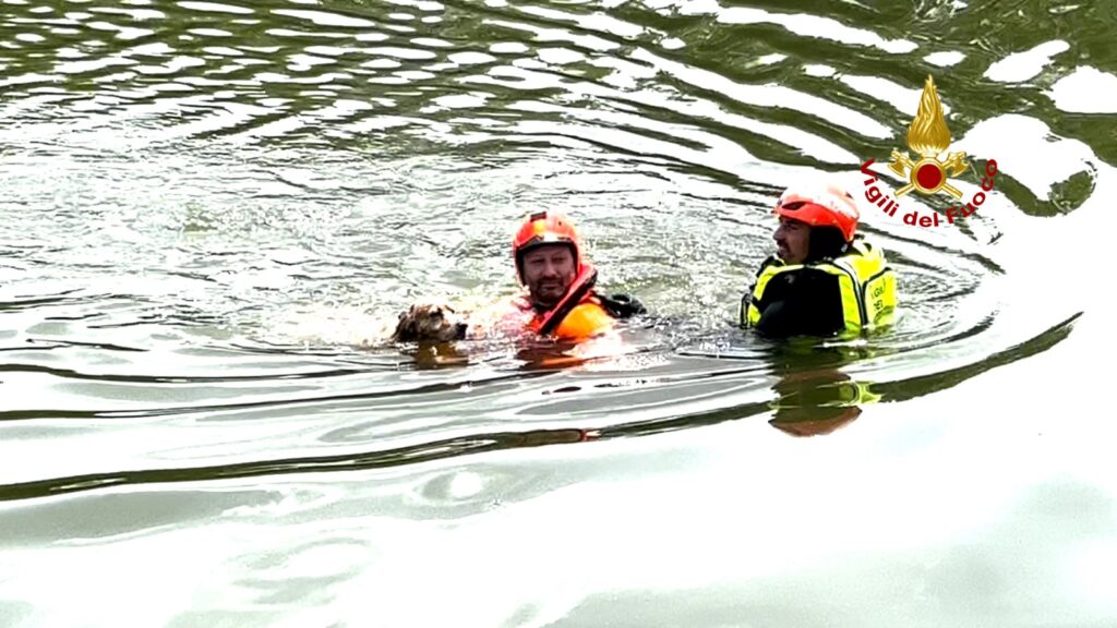 I sommozzatori hanno raggiunto a nuoto il cane al centro del fiume riportandolo a riva. Tramite il numero sul collare rintracciato il proprietario e riconsegnato in buono stato.