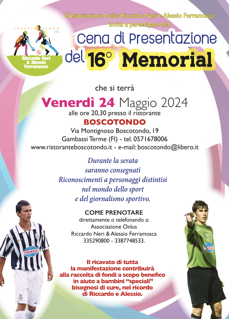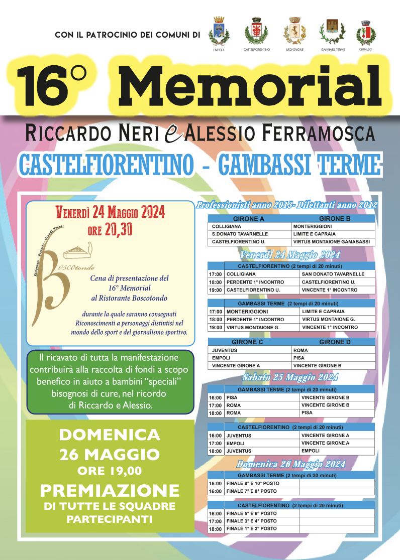 Dal 24 al 26 maggio appuntamento negli stadi di Castelfiorentino e Gambassi Terme con il 16esimo Memorial Riccardo Neri & Alessio Ferramosca. L'invito a partecipare sugli spalti è dall'associazione Riccardo Neri & Alessio Ferramosca che, in vista del Memorial, organizza la cena di presentazione venerdì 24 maggio al ristorante Boscorotondo di Gambassi Terme.