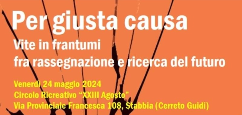 Venerdì 24 maggio 2024 presso il Circolo Ricreativo "XXIII Agosto" in Via Provinciale Francesca 108, Stabbia (Cerreto Guidi), si terrà l'iniziativa di campagna elettorale amministrativa: "Per giusta causa. Vite in frantumi fra rassegnazione e ricerca di futuro".
