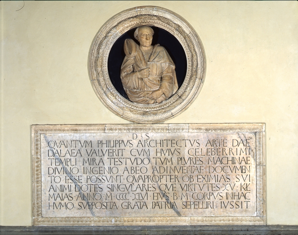 Il 15 aprile 1446 Brunelleschi muore nella sua casa a Firenze e verosimilmente il Buggiano realizza nello stesso giorno e luogo, dove anch’egli viveva, la maschera funeraria secondo un uso del mondo antico romano ben noto e praticato a Firenze. Il 30 dicembre dello stesso anno, I Consoli dell’Arte della Lana stabiliscono che il corpo di Brunelleschi, provvisoriamente deposto nel Campanile di Giotto, venga sepolto in Cattedrale. Il 18 febbraio dell’anno successivo, il 1447, gli Operai dell’Opera di Santa Maria del Fiore deliberarono la realizzazione di un monumento parietale in suo onore, costituito dalla sua “figura al naturale” e da una ‘memoria’ celebrativa epigrafica affidata al Marsuppini. Poco dopo, il 27 febbraio, Andrea Cavalcanti, da tempo attivo nel cantiere di Santa Maria del Fiore, riceve dall’Opera il marmo necessario per realizzare il monumento. Tra febbraio e marzo 1447, il Cavalcanti realizza il modello per il busto clipeato del monumento commemorativo nel Duomo di Firenze. Il monumento sarà terminato nel 1447, sappiamo che era ancora in lavorazione verso la fine di maggio quando fu approvato il testo composto dal Marsuppini. Il modello, presumibilmente, dopo la realizzazione del monumento, fu relegato nella bottega dello scultore tra i materiali di studio e sussidiari. Lo stato di conservazione dell’opera testimonia un successivo reimpiego come scultura autonoma, probabilmente conservata a lungo con la consapevolezza dell’illustre identità dell’effigiato poi in seguito caduta nell’oblio.