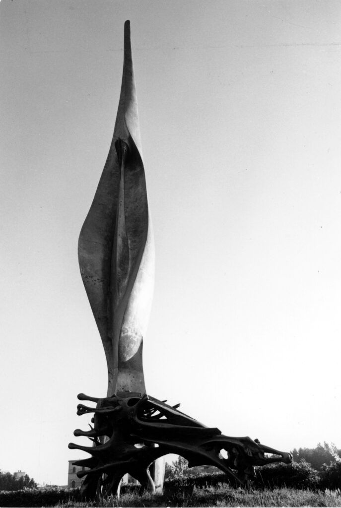«Memoria storica», questo il nome dell’opera, misura 16 metri in altezza per 4,30 in larghezza. Ritrae orizzontalmente una materia distrutta, aggrovigliata e riversa, simile a una radice arborea, che secondo le parole dello scultore significa «la macerazione e la distruzione fisica, intesa in senso umano», insieme a un elemento verticale che si eleva a partire da quella superficie e che «più che una stele è una gemma che sta a significare l’ideale in ascesa verso lo spazio, attraverso una forma scattante, pura, lirica, simbolo di chiarezza e di speranza e inoltre monito all’umanità».