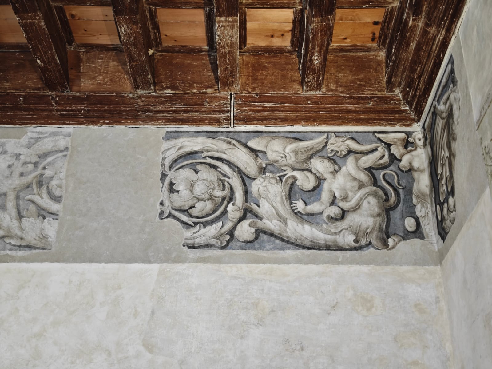Il fregio, alto circa 1 metro, occupa la fascia superiore delle pareti ed è caratterizzato da un disegno monocromo, con figure color avorio su fondo azzurro. La parete al di sotto del fregio presenta un intonaco neutro dalle caratteristiche analoghe, probabilmente destinato ad accogliere tessuti pregiati a scopo decorativo. L'opera non è stata ancora attribuita a un artista, né sono emersi dati certi sulla sua datazione. Tuttavia, dalle sue caratteristiche e dalle ricerche finora effettuate sull'edificio, la datazione potrebbe collocarsi tra la metà del Cinquecento e i primi decenni del Seicento.