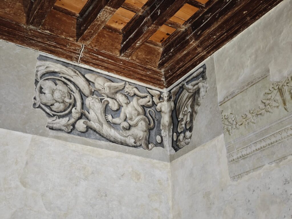 Il fregio, alto circa 1 metro, occupa la fascia superiore delle pareti ed è caratterizzato da un disegno monocromo, con figure color avorio su fondo azzurro. La parete al di sotto del fregio presenta un intonaco neutro dalle caratteristiche analoghe, probabilmente destinato ad accogliere tessuti pregiati a scopo decorativo. L'opera non è stata ancora attribuita a un artista, né sono emersi dati certi sulla sua datazione. Tuttavia, dalle sue caratteristiche e dalle ricerche finora effettuate sull'edificio, la datazione potrebbe collocarsi tra la metà del Cinquecento e i primi decenni del Seicento.