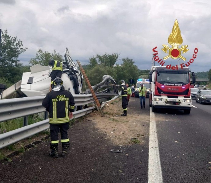 I vigili del fuoco di Arezzo sono intervenuti per un incidente stradale in A1, in direzione Firenze al km 352. Nello scontro sono coinvolti un camion che trasportava olio, ribaltatosi, e autovettura che era ferma in corsia di emergenza.