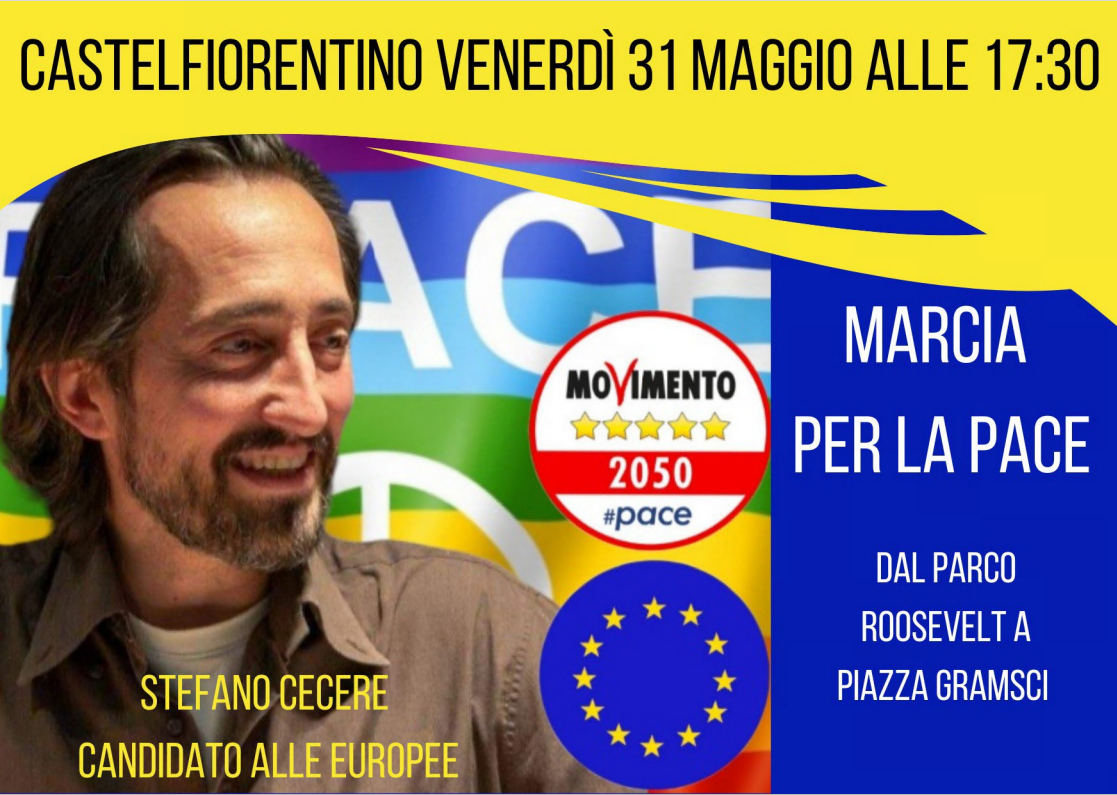 Venerdì prossimo, 31 maggio alle ore 17.30 verrà proposta una marcia per la pace a Castelfiorentino. Questo il percorso: ritrovo alle 17.30 al parco Roosevelt (viale Roosevelt), partenza h. 17.45 passando per il ponte Falcone e Borsellino, Piazza Kennedy, Via Volontari del Sangue, arrivo in Piazza Gramsci per il Comizio finale. Parleranno il candidato sindaco del Movimento 5 Stelle Fabrizio Macchi, la candidata di Europa Verde Cecilia Bassi al Parlamento Europeo e Stefano Cecere del Movimento 5 Stelle candidato al Parlamento europeo per la Circoscrizione centro. Interverrà Damiano Ghiozzi, capolista del partito di coalizione Europa Verde.