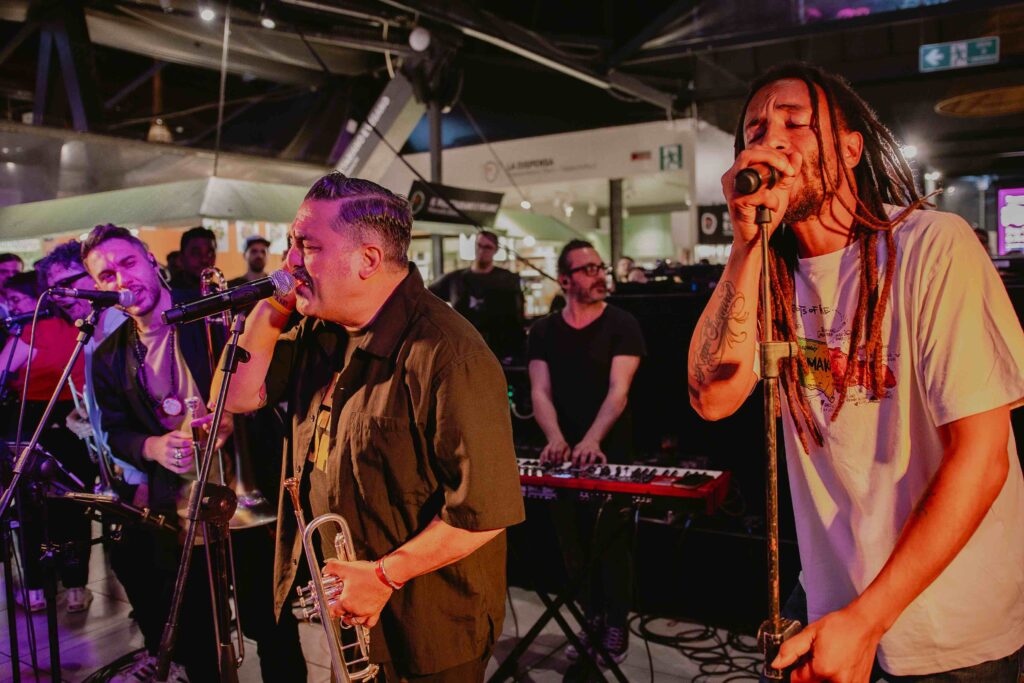 Neanche la pioggia ha fermato la festa, tra gli ospiti esibiti c’è la performance di Roy Paci & Aretuska che con i loro ritmi ska-jazz hanno saputo coinvolgere il pubblico riunito al primo piano del Mercato.