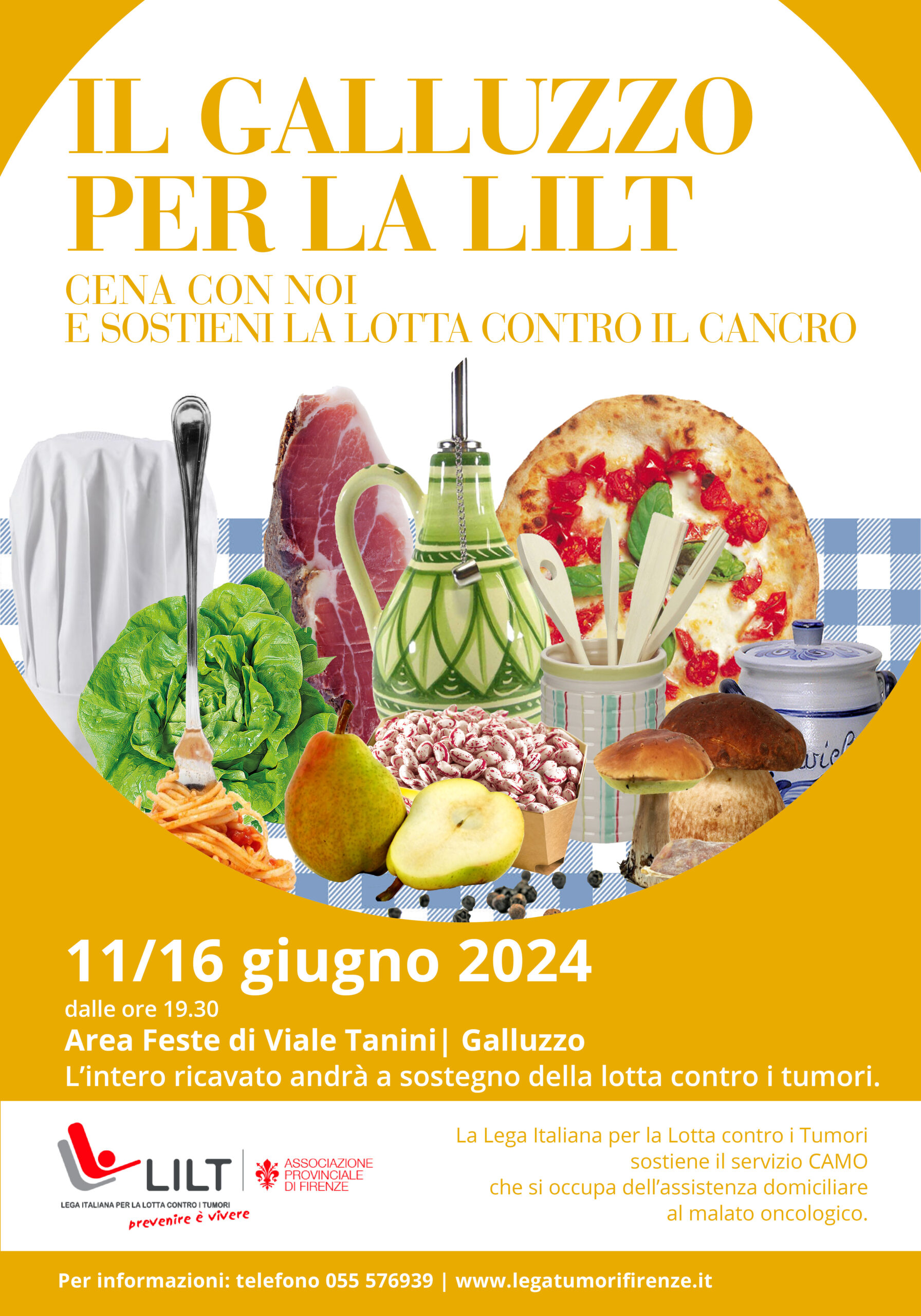 La solidarietà è servita in tavola. Torna la rassegna di cene “Il Galluzzo per la Lilt”, dall'11 al 16 giugno (ogni sera dalle ore 19) nell’Area Feste di viale Tanini a Firenze, per sostenere la Lega Italiana per la lotta contro i tumori.