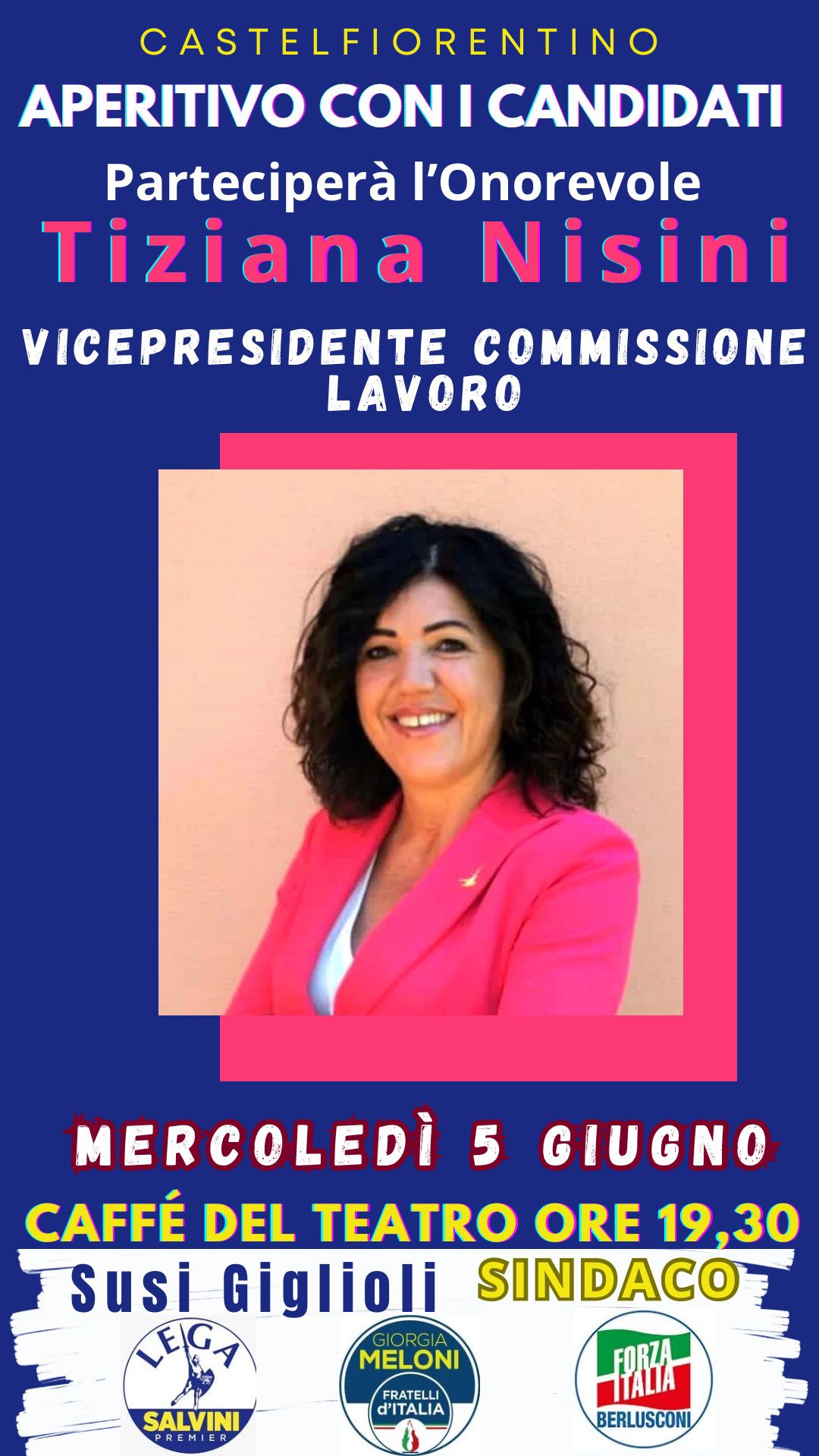 A Castelfiorentino in Piazza Gramsci sarà presente, a sostegno della candidata sindaco Susi Giglioli, l'onorevole Tiziana Nisini: vice presidente Commissione Lavoro. Si terrà un aperitivo con i candidati, militanti e simpatizzanti di centro destra.
