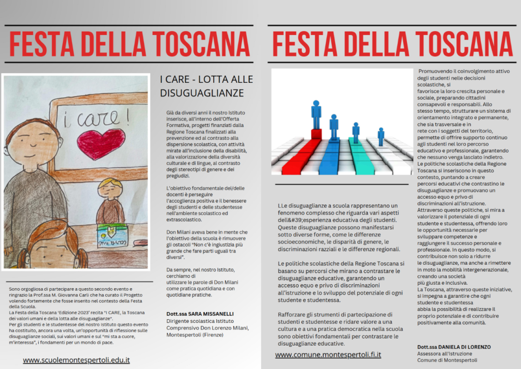 Nasce l'e-book per la Toscana, terra dei diritti nel segno dell'I Care di don Milani. Nell'e-book dal titolo "I Care, la Toscana dei valori umani e della lotta alle disuguaglianze a 100 anni dalla nascita di don Milani" pagina dopo pagina, il lettore potrà scorrere l'intera esperienza dell'Istituto comprensivo don Lorenzo Milani, diretto da Sara Missanelli, nel progetto di Giovanna M. Carli per la Festa della Toscana realizzato con la compartecipazione del Consiglio regionale.