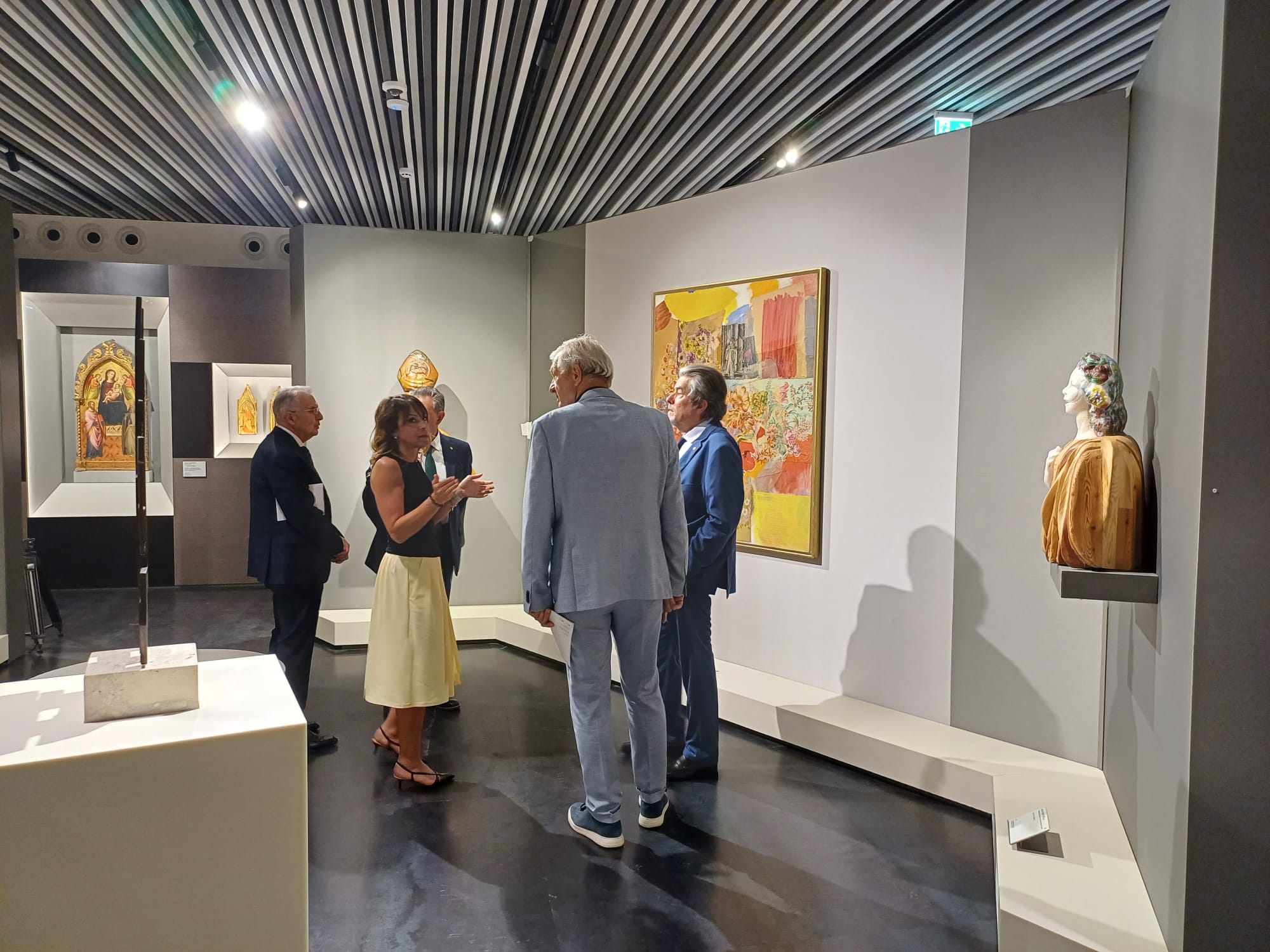 Un percorso espositivo, curato da Serena Nocentini - direttrice scientifica del Centro Culturale Cambio - nel quale dialogano antichi e nuovi maestri: dalle Maternità dello Scheggia e di Venturino Venturi che condividono tenerezza e angoscioso presentimento, ai fondi oro di Sergio Manzi che si riflettono in quelli del Trecento; dalla vividezza delle maioliche di Montelupo alle lucenti visioni di Beppe Serafini. E allo stesso tempo, contempla molteplici tecniche e ambiti: