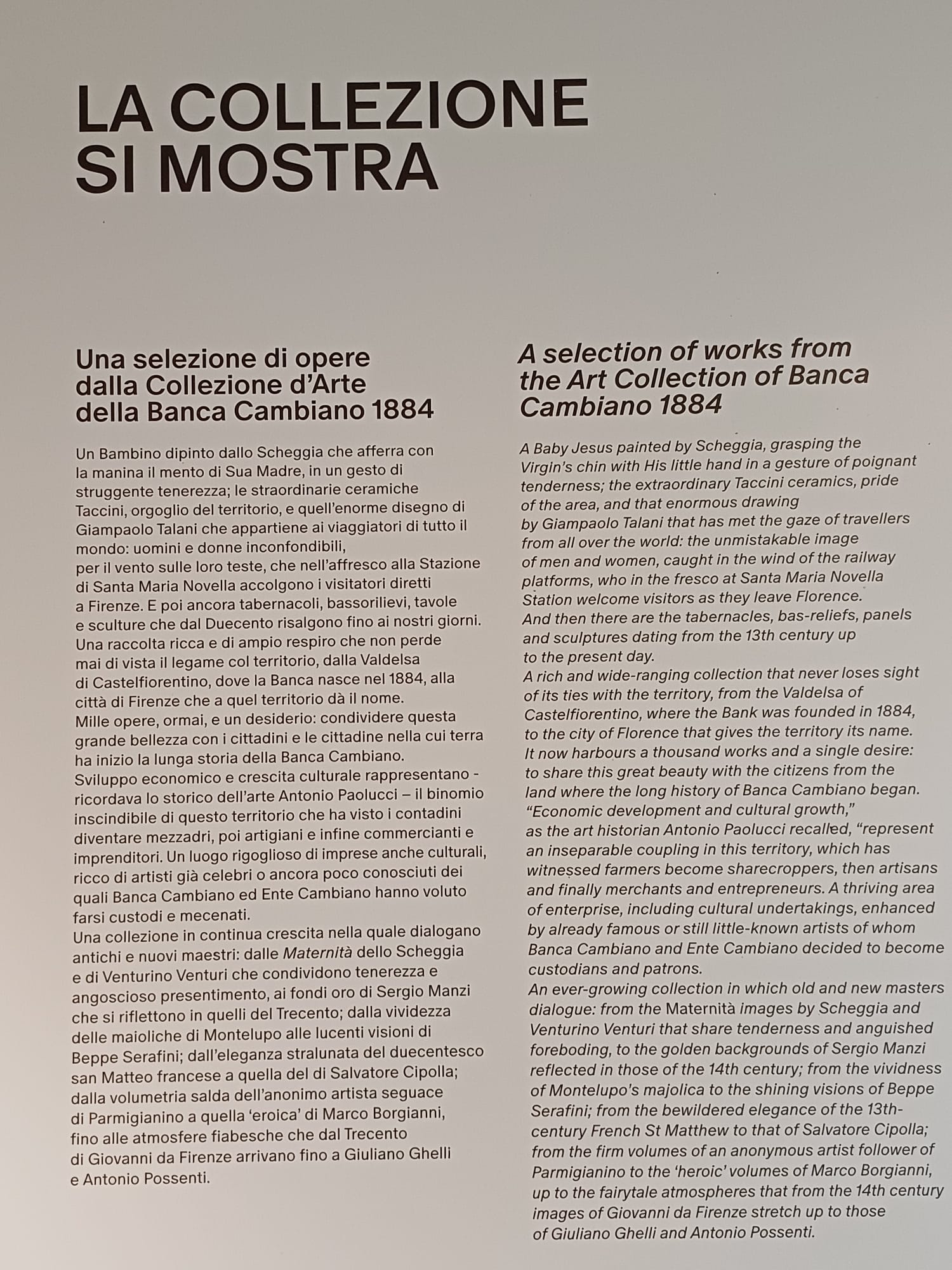 "Si tratta di una raccolta ricca e di ampio respiro, che mette in dialogo antichi e nuovi maestri, e che non perde mai di vista il legame col territorio, dalla Valdelsa di Castelfiorentino alla città di Firenze che a quel territorio dà il nome. Una selezione di oltre mille opere e un desiderio: condividere questa grande bellezza con i cittadini e le cittadine nella cui terra ha inizio la lunga storia della Banca Cambiano" commenta Serena Nocentini, curatrice della collezione e del Centro Cambio.