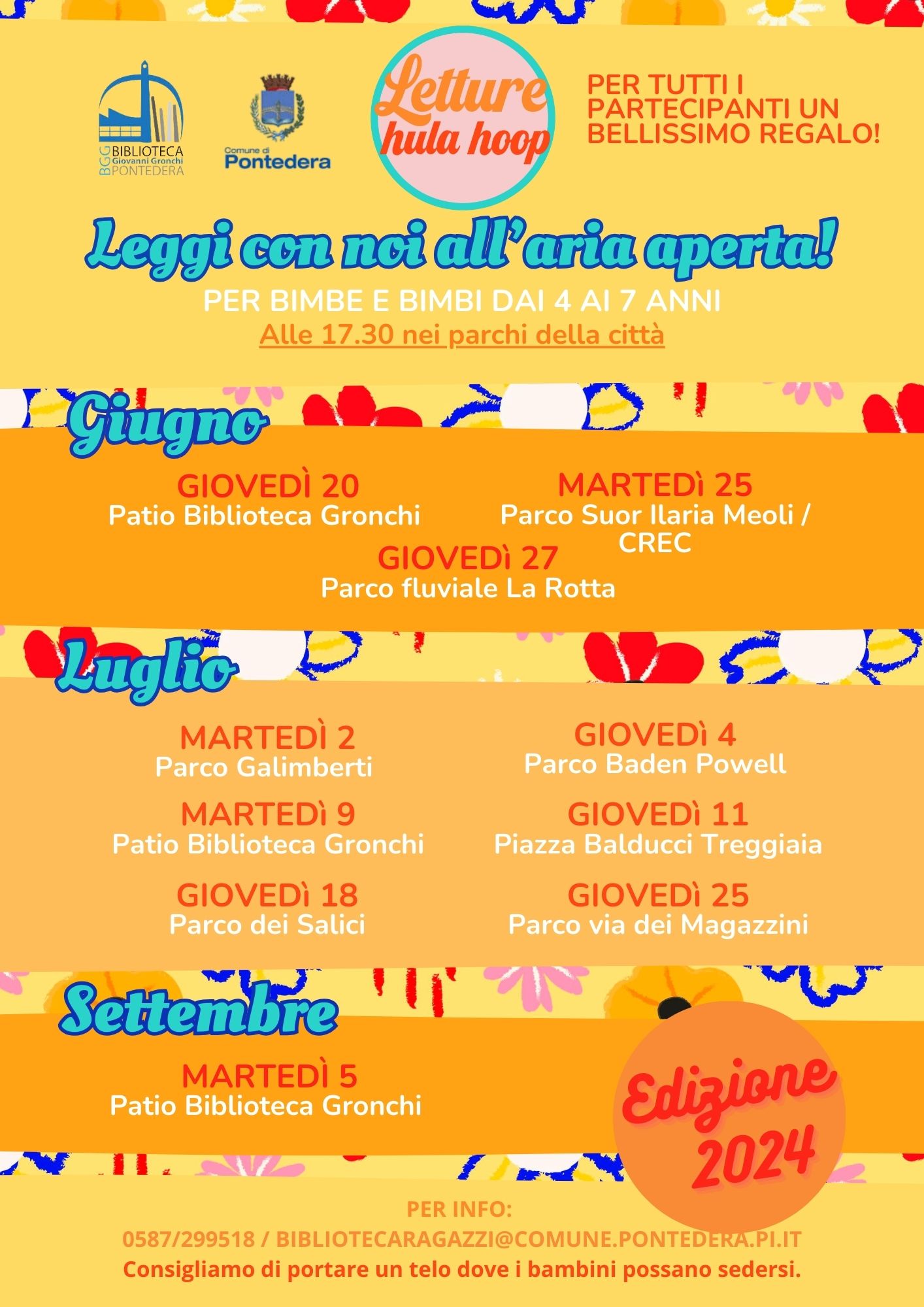Il ciclo di letture all’aria aperta è giunto alla quinta edizione e il primo appuntamento sarà nel patio della Biblioteca comunale Gronchi. Ma, grazie a bibliotecarie prontissime a spostarsi nei parchi cittadini e nelle frazioni, la Gronchi sparpaglierà storie e spensieratezza con dieci appuntamenti. Dopo l'inaugurazione sono previsti altri due appuntamenti a giugno: il 25 al parco Suor Ilaria Meoli e il 27 al parco fluviale a La Rotta, con orari sempre a partire dalle 17,30 e che coinvolgeranno anche educatrici, maestre, bambini e famiglie dei due Poli 0-6 di La Rotta e del Villaggio Piaggio. Con loro ci saranno anche un'alunna del Liceo Montale, Damiana, che ha sperimentato l’esperienza di alternanza scuola-lavoro in Biblioteca Gronchi e Siham e Naima, studentesse del CPIA di Pontedera che hanno svolto un servizio di service learning in biblioteca.