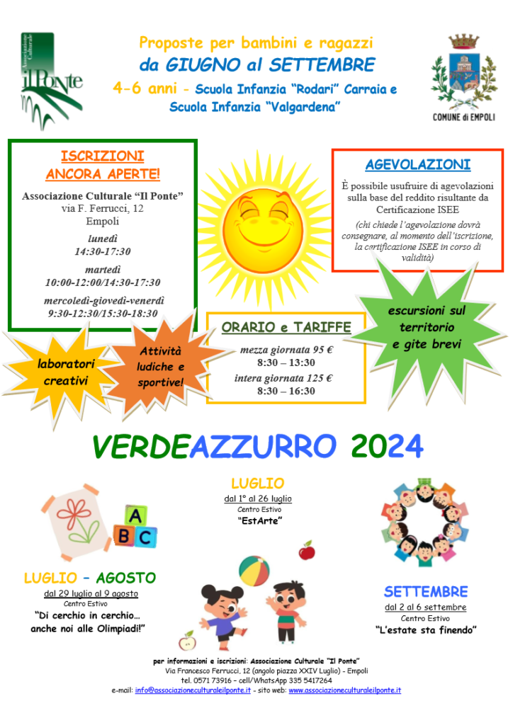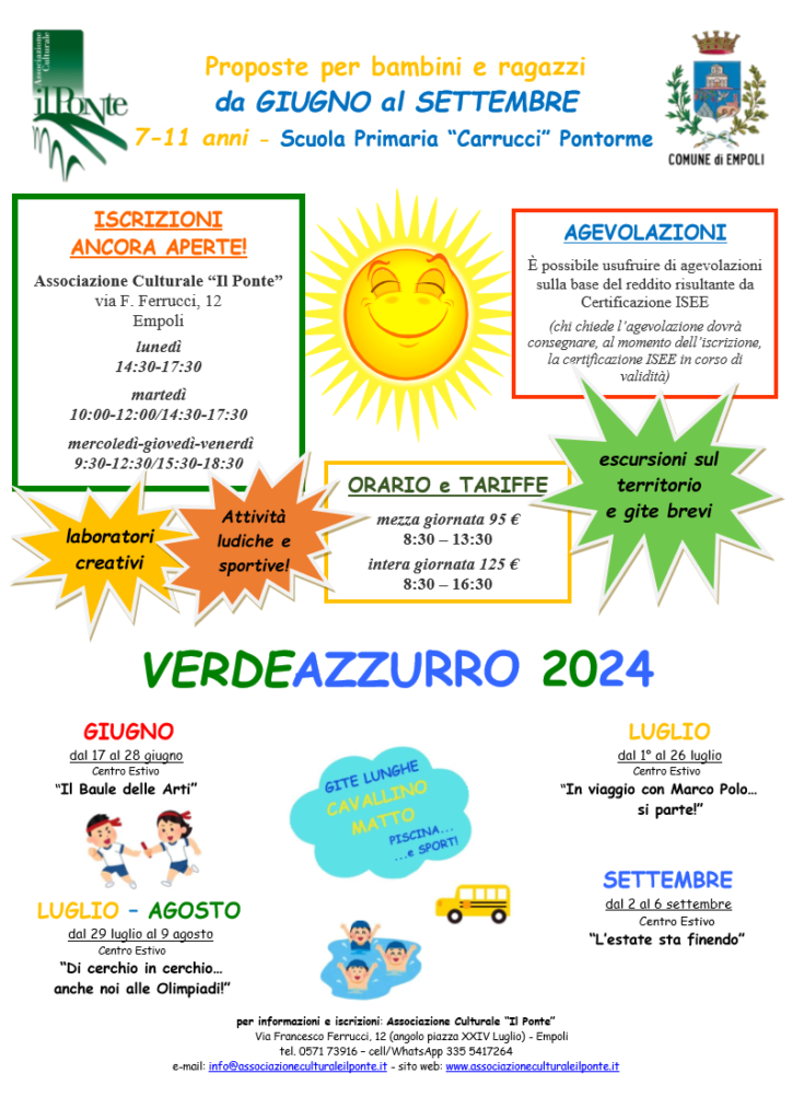 Ancora aperte le iscrizioni ai Centri Estivi rivolti a bambini e ragazzi da 4 a 6 anni e da 7 a 11 anni organizzati dall’Associazione Culturale “Il Ponte” per il Comune di Empoli.